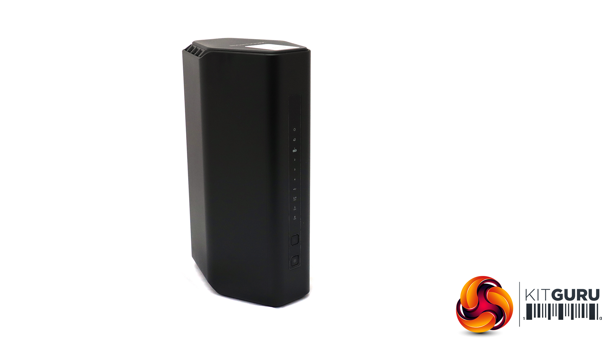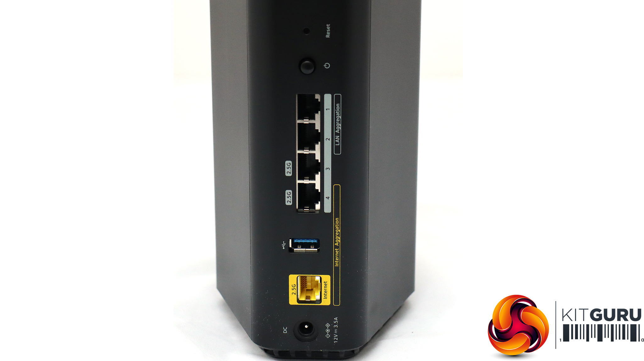 The ports are ranged vertically up the back of the router, with a recessed reset and regular on-off button at the top. Below that is a pair of Gigabit Ethernet LAN ports, which can be aggregated together when routed to a Network Attached Storage device. Below that is a pair of 2.5Gbit Ethernet LAN ports. The lower of these can be aggregated with the 2.5Gbit Ethernet WAN port at the bottom, to create a 5Gbit link to a compatible modem. In between these two is a USB 3.0 port, which can only be used for adding storage, not sharing a printer or mobile data modem.