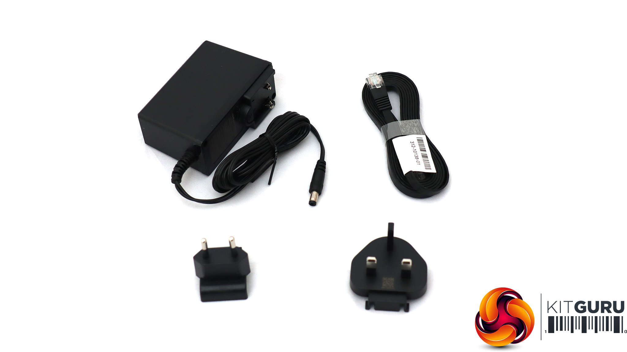 The power supply comes with European and UK plug pin options, and there's a skinny Cat 5 Ethernet cable included as well, intended for use with the broadband modem.