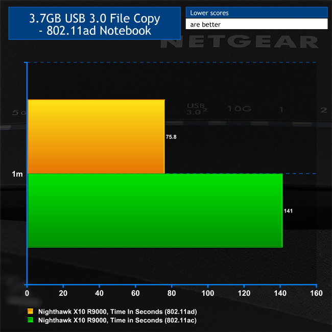 We tested the NETGEAR Nighthawk X10 R9000 in two ways. First, we wanted to assess the raw throughput across the three different WiFi standards it supports – 802.11ad, 802.11ac and 802.11n. We also tested the speed of the USB 3.0 port via 802.11ad.