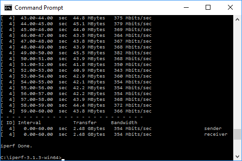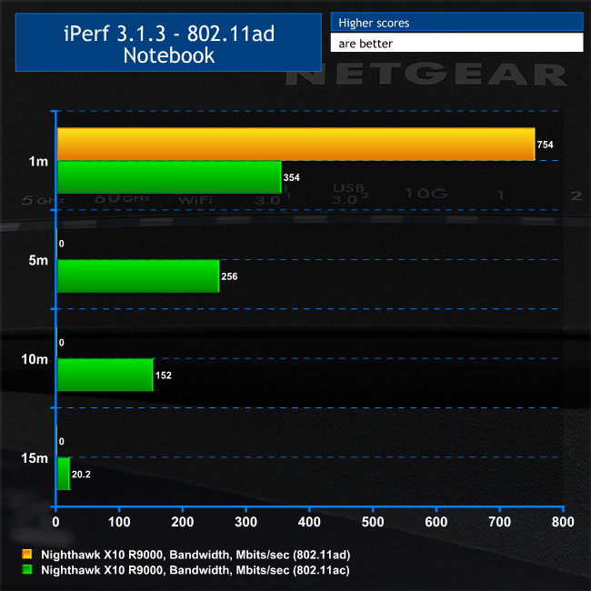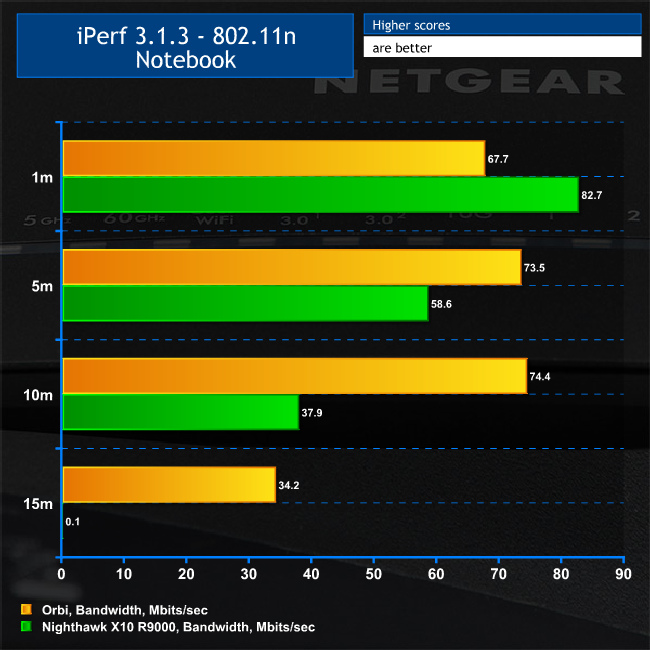 With each WiFi standard and distance, we took 60 readings of throughput at one second intervals and calculated the average (iPerf does this automatically). For selected tests, we are also comparing the R9000’s performance with the NETGEAR Orbi. Note that for the wireless tests the Orbi’s satellite was at the same 10m distance as the notebook.