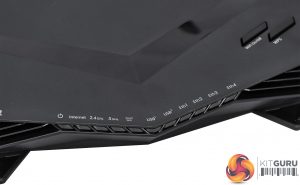 The port allocation is normal for a router in this class. There are four Gigabit Ethernet connections for general LAN devices, plus a fifth for your broadband connection. The only really novel feature here is the discrete switch for turning the front LEDs on and off, should you find them too distracting or if your router happens to be in your bedroom.
