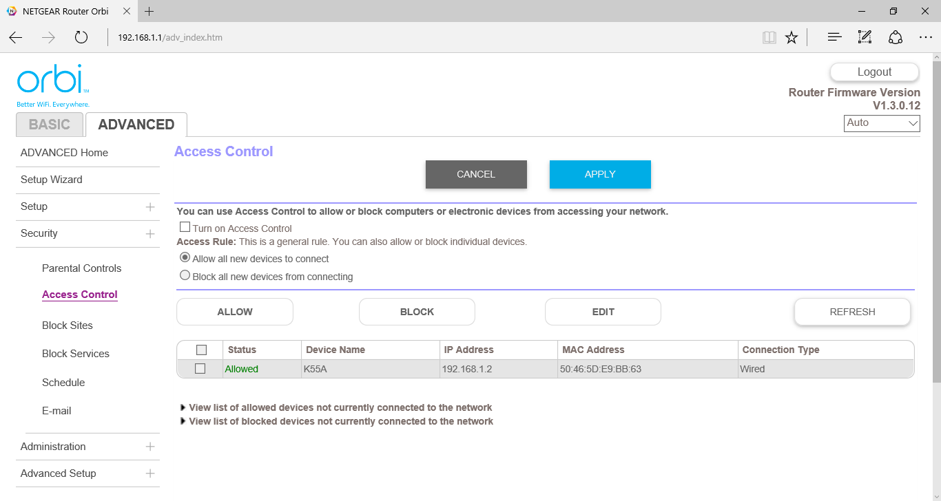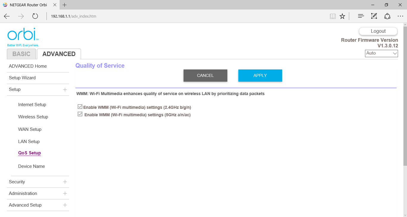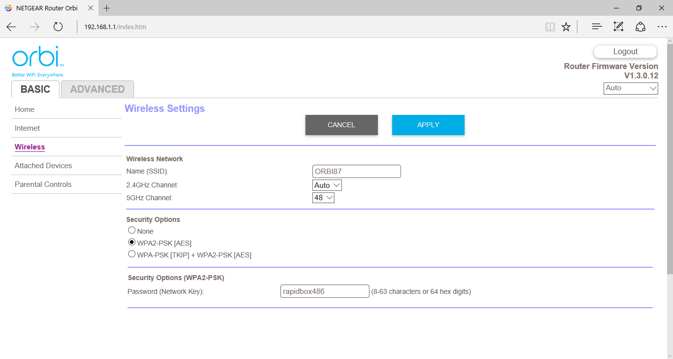 In Basic mode, the Wireless setings let you change the SSID and channels for 2.4GHz and 5GHz networks, as well as which security method to use. Note that the SSID and password are shared across both WiFi frequencies, which part of how the Orbi provides a seamless wireless experience.