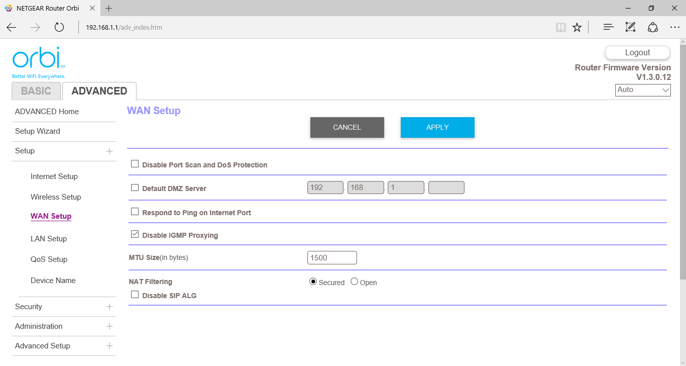 The WAN Setup section provides the usual options to set up a de-militarised zone (DMZ) and configure various anti-hacking settings.