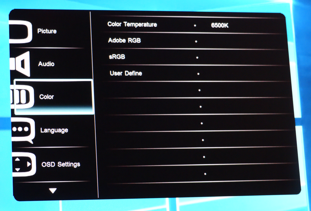 In the Color section you can choose a Color Temperature preset in Kelvin, or presets for Adobe RGB and sRGB, or use red, green and blue sliders to configure a user-defined colour profile.