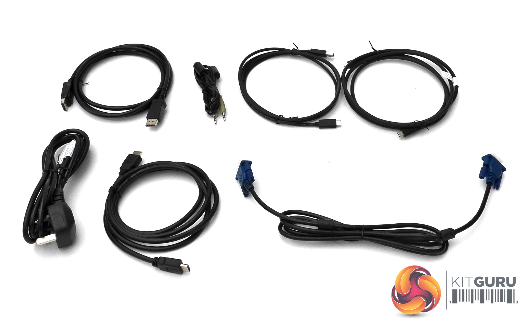 You get a full set of wiring inside. There are cables for every single type of display connectivity, including DisplayPort, HDMI, D-Sub and two different types of USB-C. One is from Type C to Type C, the other ends in Type A, should you need to use the USB hub with a computer that doesn't have a Type C connection.