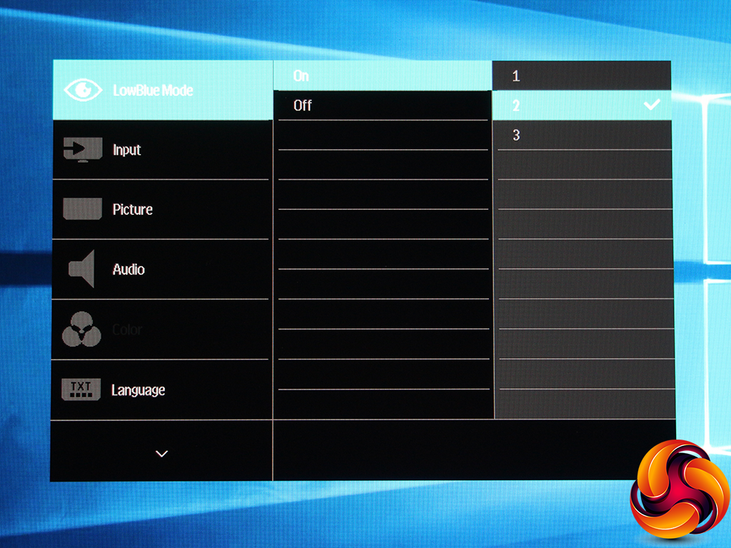 Finally, with the fourth button you can access the main menu. The default first submenu is the LowBlue Mode setting, with options from 1 to 3. This reduces the blue level to ease eye strain.