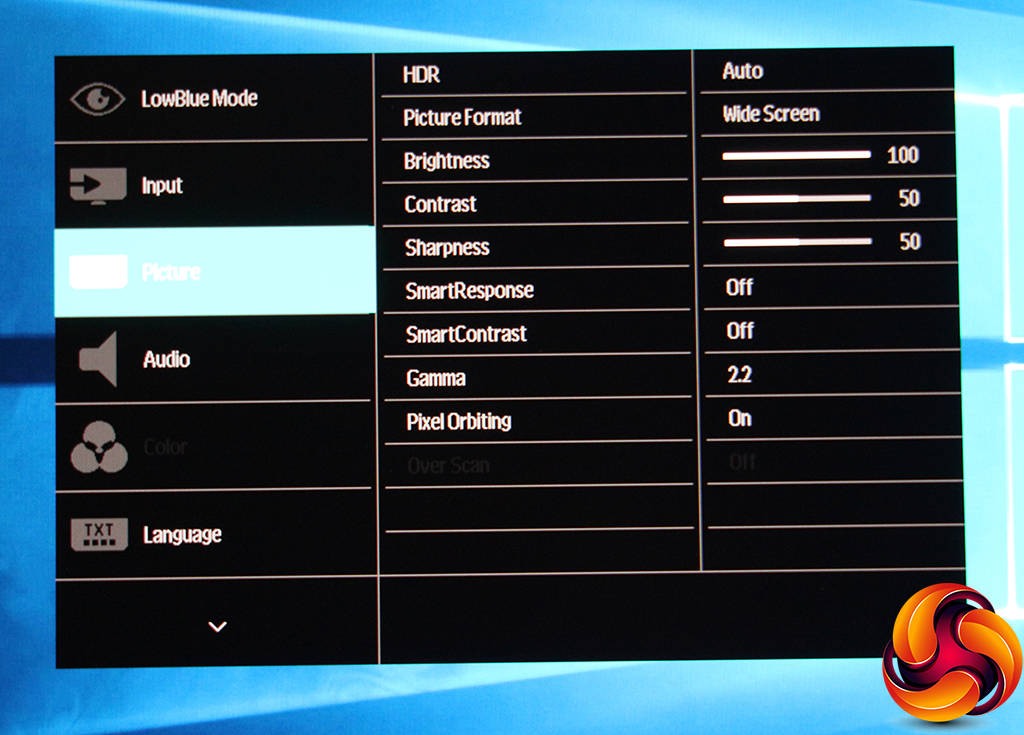 SmartContrast varies the backlight to create a greater perception of contrast between light and dark. The Gamma setting has 1.8, 2.0, 2.2, 2.4 and 2.6 settings. There's also a Pixel Orbiting system to prevent burn-in if a static image is left onscreen for long periods. The greyed out option you can hardly see controls Over Scan with analog VGA inputs.