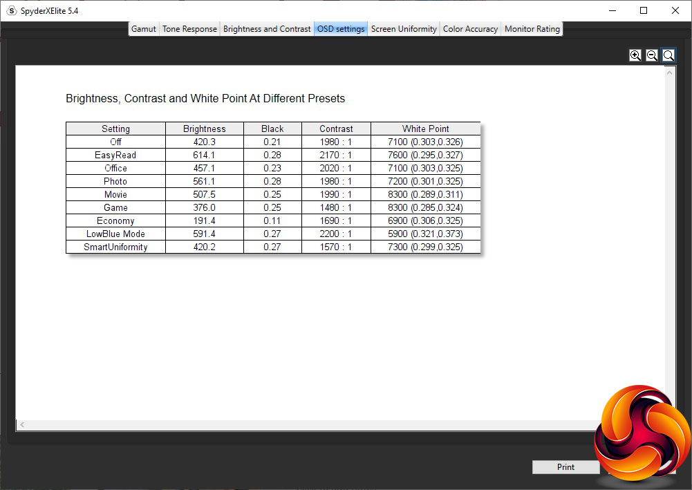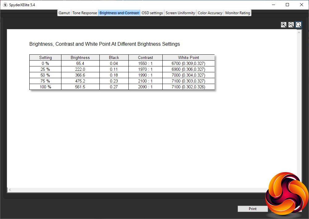 - A monitor’s contrast ratio at various brightness levels in the OSD.