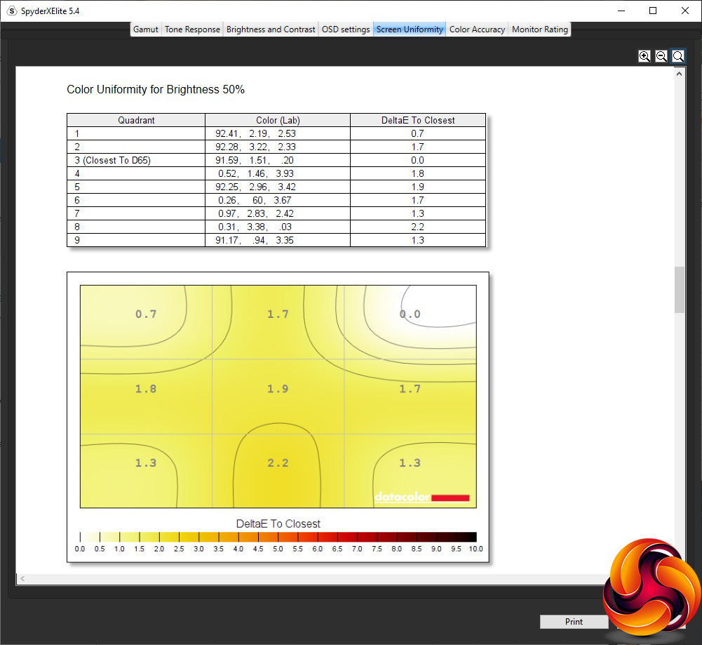 Our main test involves using a DataColor SpyderX Pro Colorimeter to assess a display’s image quality. The device sits on top of the screen panel surface while the software generates colour tones and patterns, which it compares against predetermined values to work out how accurate the screen is.
