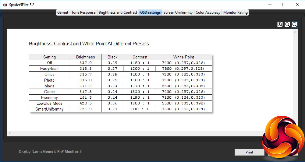 There are many OSD presets on offer, and they vary quite a bit. The default Off equates to 337.9cd/m2 brightness, 1,180:1 contrast and 7400K white point. EasyRead, Office, Photo and Game all use brightness around the 315cd/m2 mark, although Game contrast is highest at 1,320:1, Office and Photo use 1,100:1, and EasyRead 1,200:1.