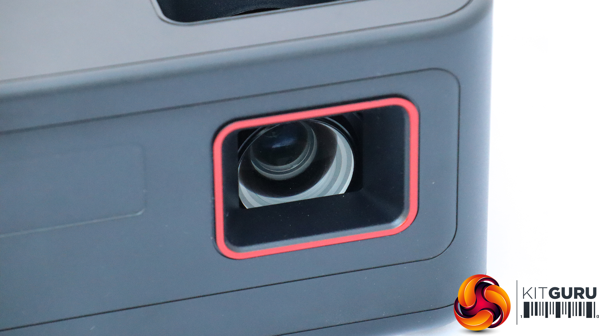 The GamePix 900 is quite fat as projectors go. We quite like the red edging around the lens hole. A projector is not something where you drool over the design, but we do rather like the dark grey matte finish and overall look of the unit. You can manually adjust the lens through the hole in the top. However, there are no physical buttons on the unit at all, so if you lose the remote control (see below) you will be a bit stuffed. The build quality also feels average rather than premium.