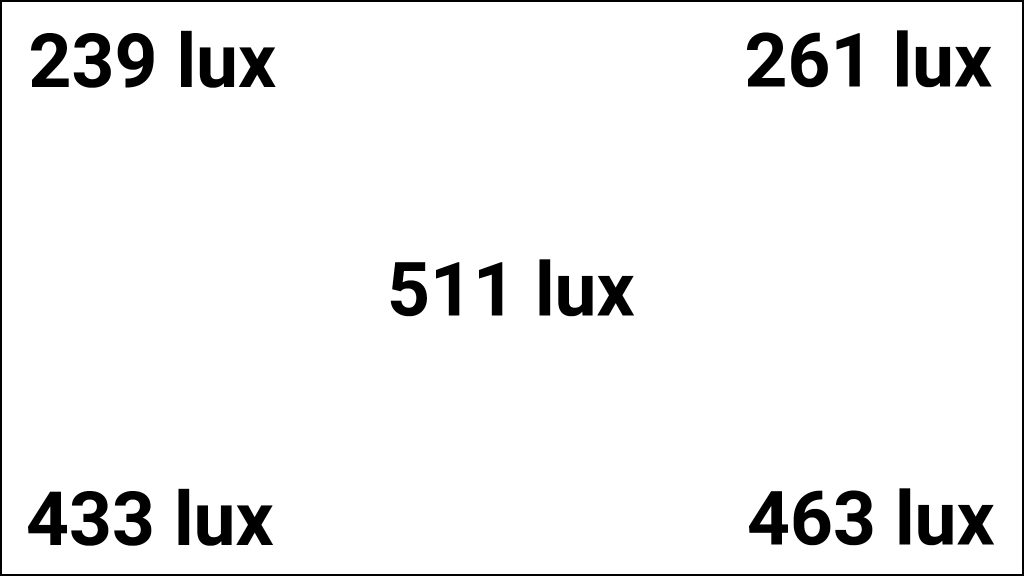For our illumination test, you'll notice that the screen is brighter at the bottom than the top, which will mostly be because our projector stand was a lower than the edge of the screen and pointing upwards. The rating to take most notice of is the middle one of 511 lux. It's also worth mentioning that at maximum brightness the screen image was very washed out and you would never want to use it at that level.