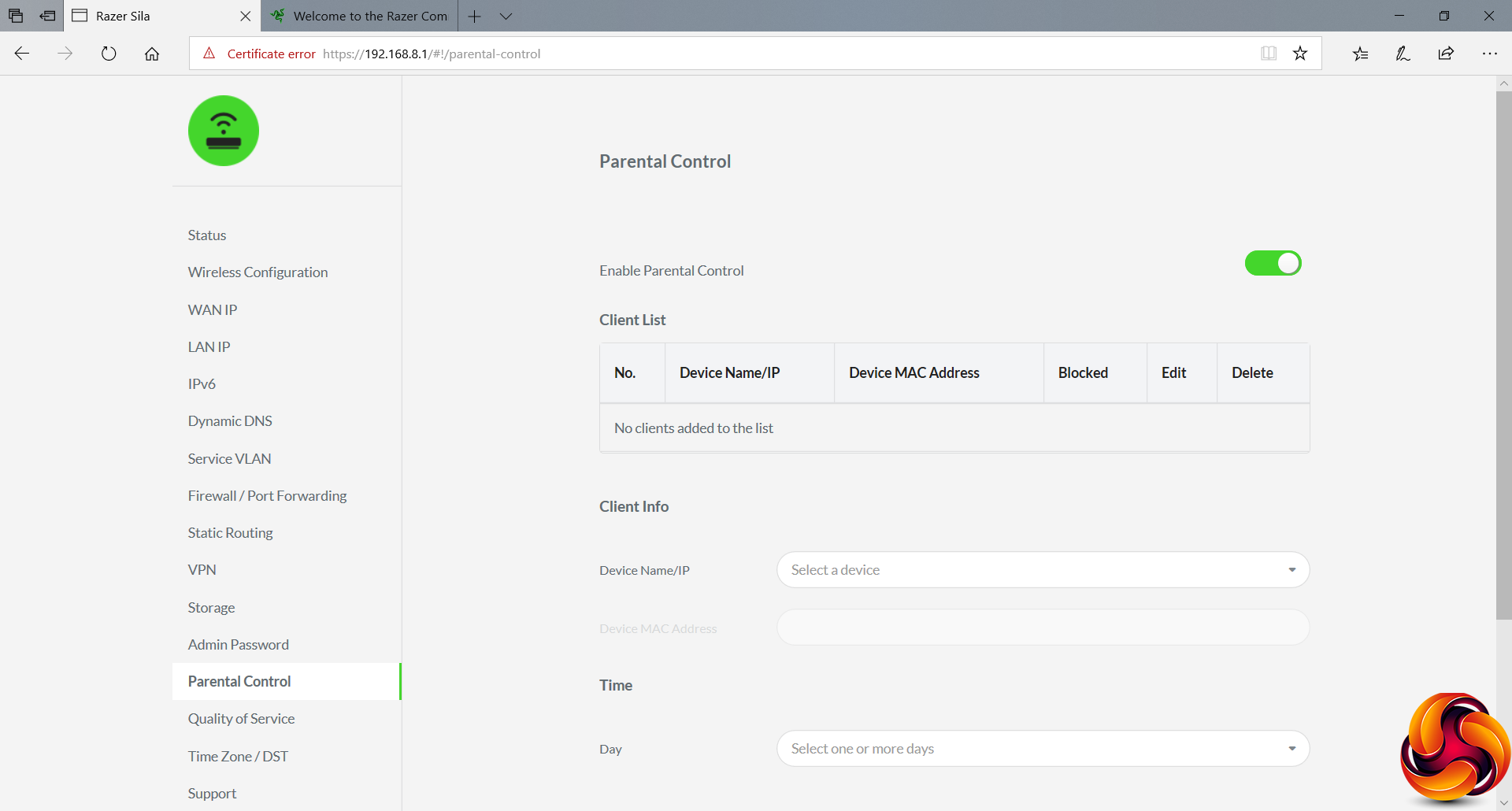 The Admin Password just provides the option to change the admin password, unsurprisingly. But the Parental Control section lets you configure access profiles for individual devices based on times of day and days of week.