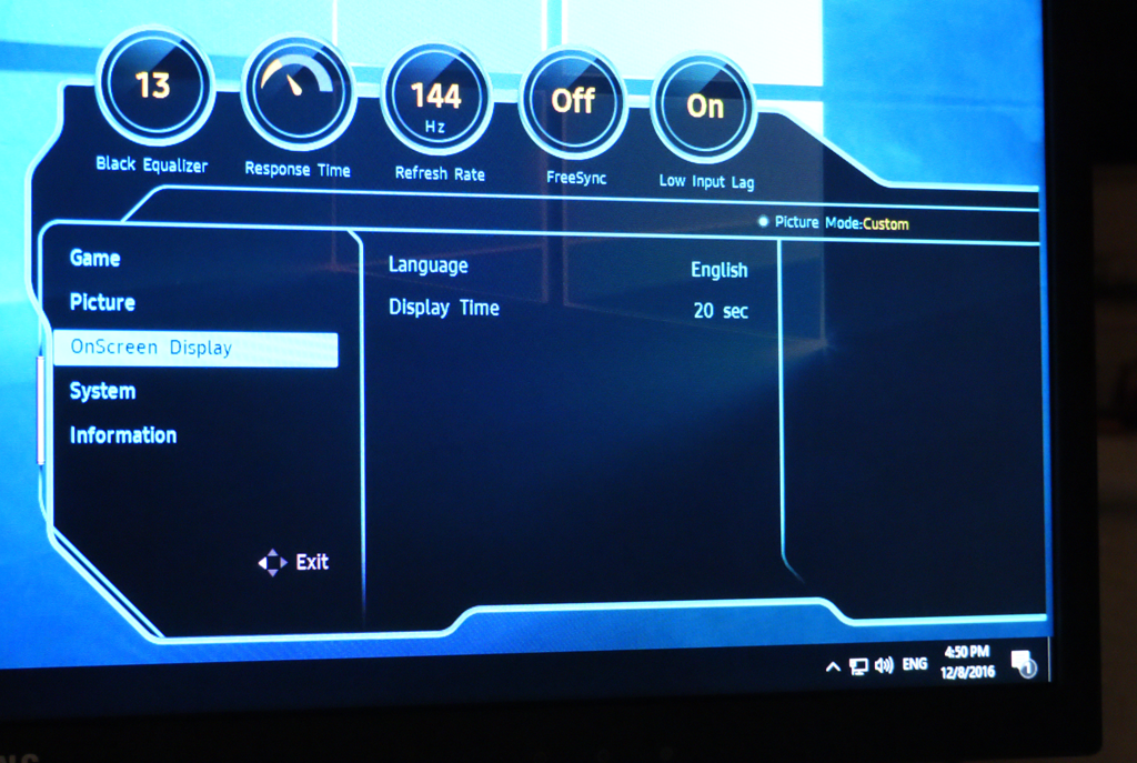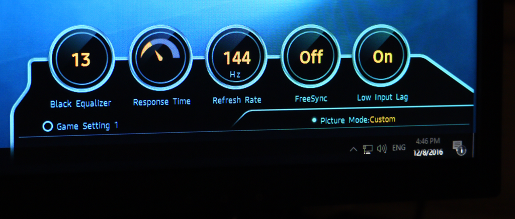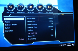 The full OSD provides five submenus – Game, Picture, OnScreen Display, System and Information. The Game menu lets you choose the Picture Mode presets, change the refresh rate from the default 144Hz, select the Black Equalizer setting, choose a Response Time of Normal, Faster, or Fastest, toggle FreeSync and Low Input Lag, or alter the aspect ratio of the frame. You can then save all these settings into one of the three preset slots that are activated by the buttons on the bottom of the bezel.