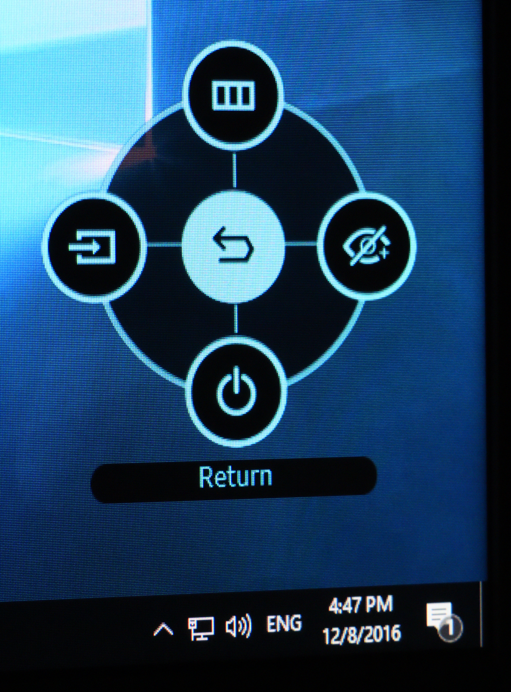 Press the joystick in and the primary menu appears. You can select input source on the left, turn Eye Saver mode on or off to the right, and turn the monitor off downwards. But pushing upwards takes you to the detailed settings menu.