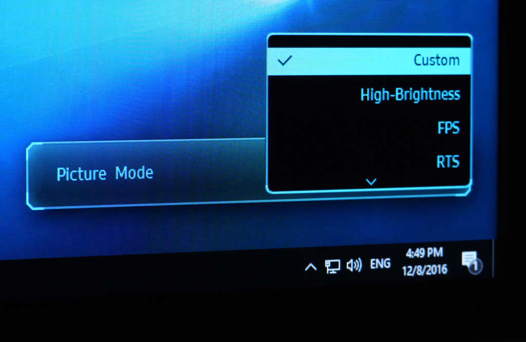 Both the Game and Picture submenus let you change the Picture Mode. There is a plethora of presets here for the main genres of game, including FPS, RTS, RPG and AOS (like DotA and LoL). There's also a High-Brightness option, sRGB and Cinema.