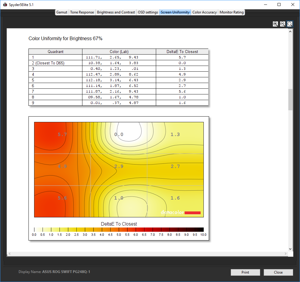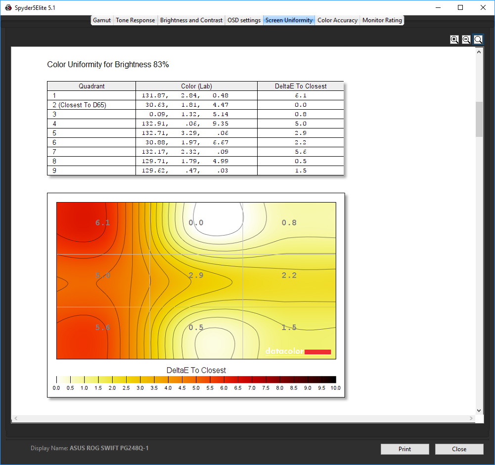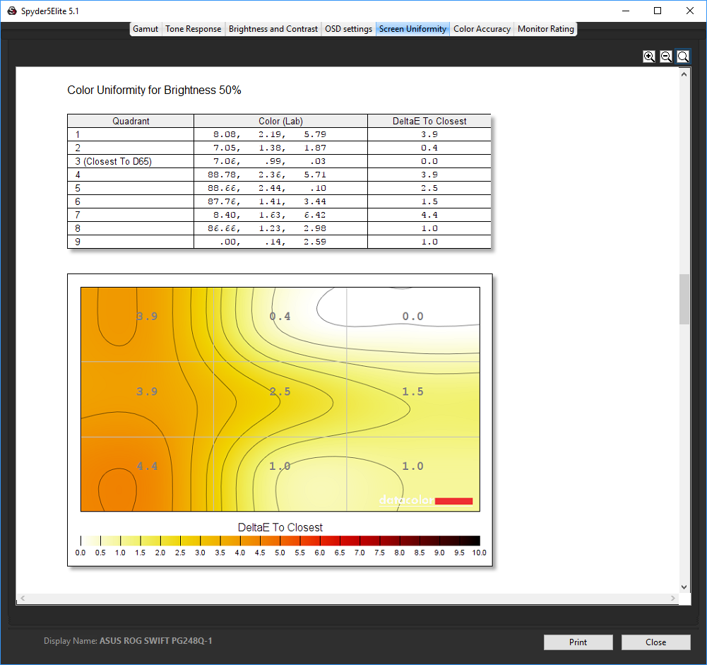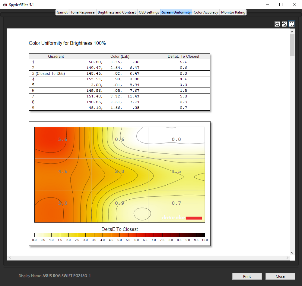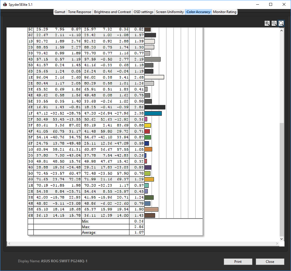 In the case of the Samsung, we performed the primary testing at the native 1,920 x 1,080 resolution in the default Custom preset mode. We also left the monitor at 60Hz (which is not the default – this is 144Hz) because higher refresh rates can affect colour performance. Our test system was equipped with an NVIDIA Quadro K2200. Note that the screenshots below have the wrong Display Name at the bottom. They were not the results of the ASUS ROG SWIFT PG248Q, but for some reason the Spyder system insisted on keeping that monitor name from a previous test.