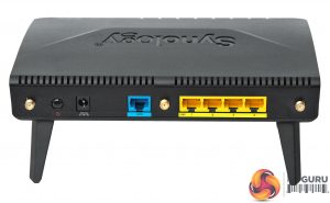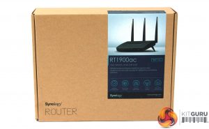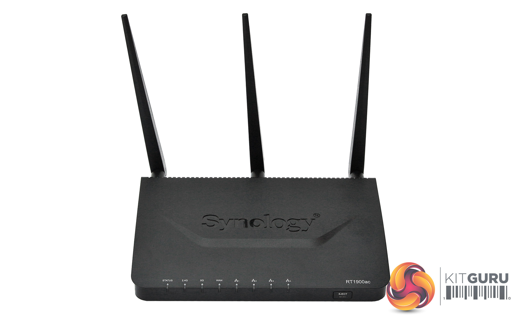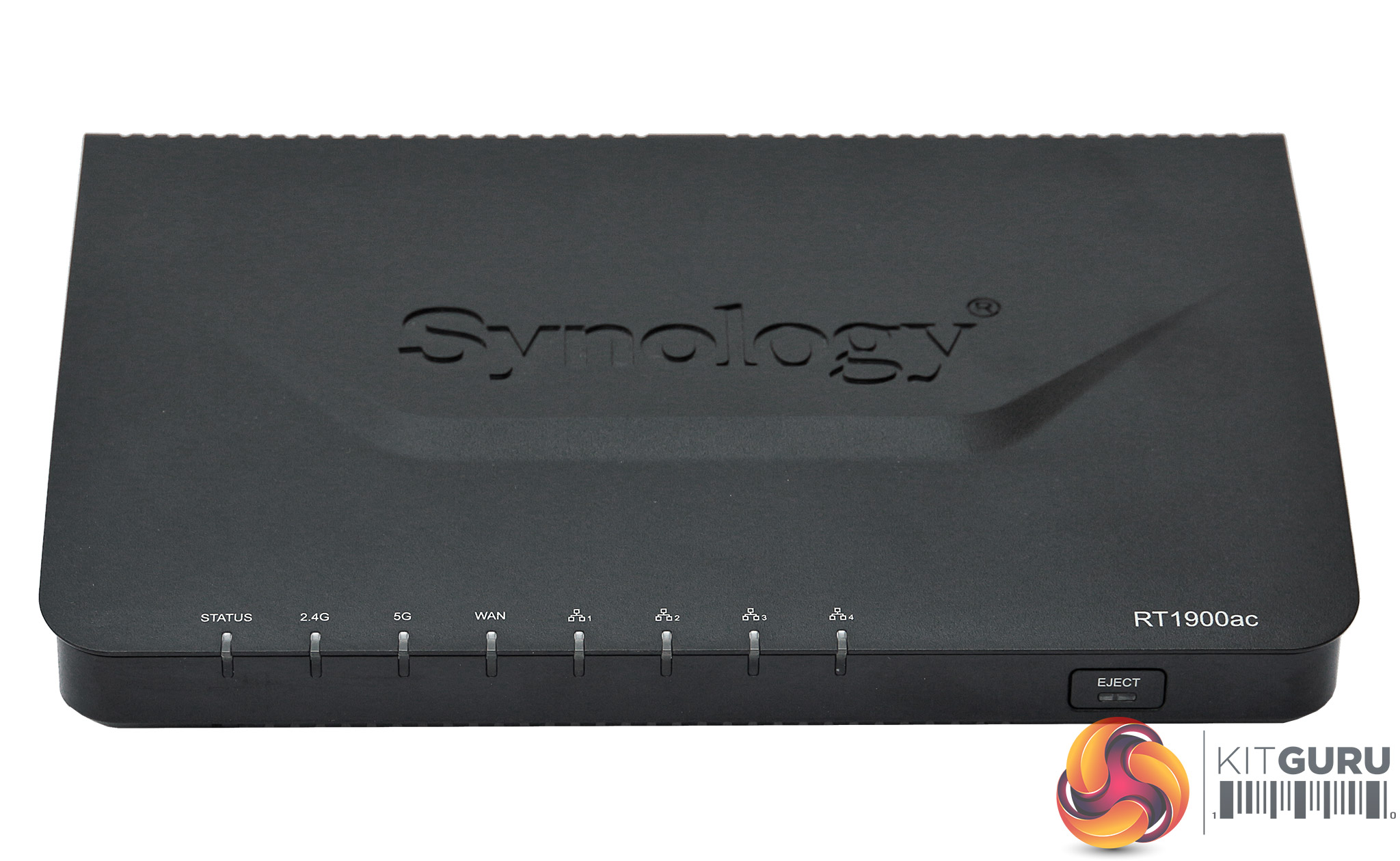 The RT1900ac is very utilitarian in design. So here again there is a distinct lack of any form of nonsense. The three external antennas screw onto the rear, and there is a row of LEDs along the front. The protruding hump with the Synology logo on it is about the only nod in any kind of design direction.