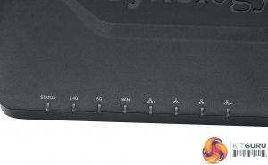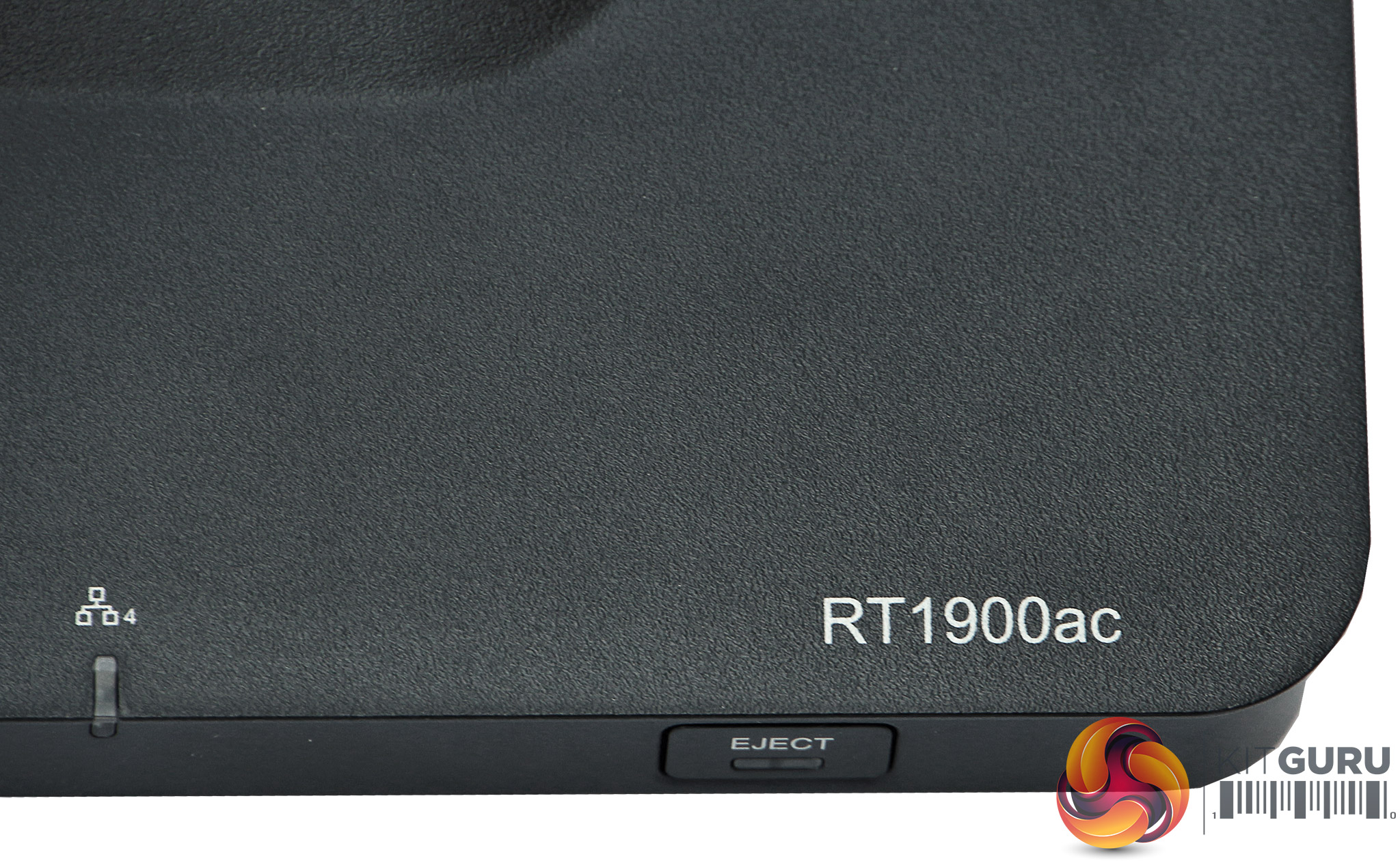An eject button on the front is used for unmounting storage devices so they can be removed safely without you having to load up the management interface. The status LEDs along the front show you the overall router status, plus activities on the two WiFi wavebands, WAN, and four Gigabit Ethernet ports.