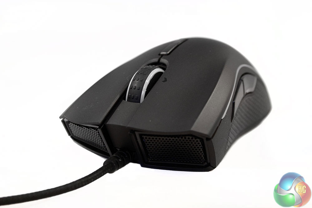 At the front end, you have the usual left and right mouse buttons, surrounding the embedded scroll wheel. The wheel has a textured rubber surface to make it easy to grip and as well as having the secondary button press function when depressed, it can also be rocked from side to side for two additional keys. By default, they scroll up and down without you needing to flick the wheel.
