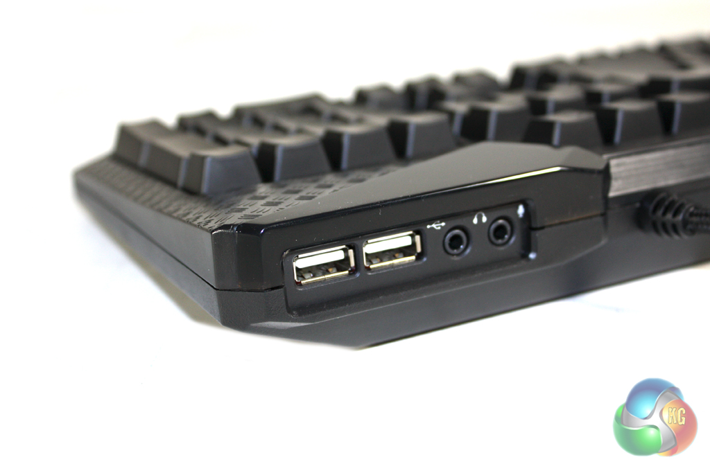 We find a two port USB2.0 hub on the back edge of the keyboard, alongside headphone and microphone pass through 3.5mm jacks.