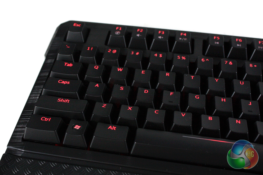 Along the top edge of the keyboard we find the F1 – F12 buttons in the usual place. These all have second functions attributed to them – with F1 to F6 representing multimedia functions, F7 to F11 representing hot keys to switch between macro profiles and F12 enabling gaming mode (disabling the Windows button).