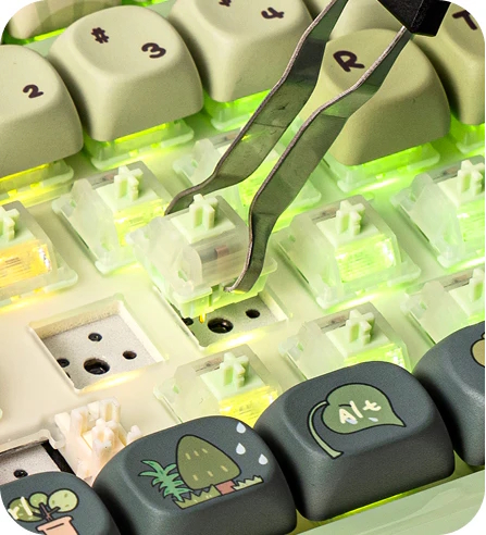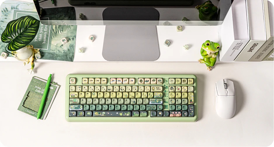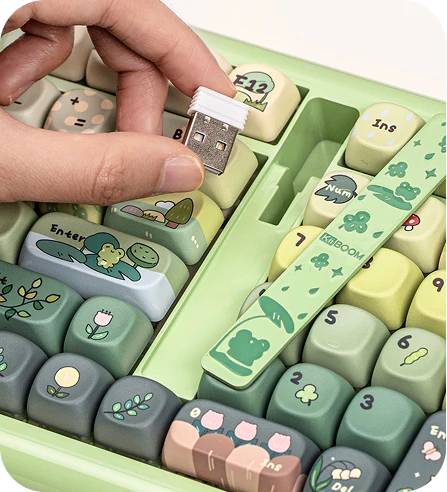 Available in green, pink, and translucent, the Phantom98 Lite pairs a glossy UV-glazed case with PBT dye-sublimated themed keycaps. Interestingly, KiiBOOM has integrated a magnetic nameplate that doubles as a hidden storage compartment for the 2.4G wireless receiver, ensuring you won't lose your dongle when transporting the keyboard.
