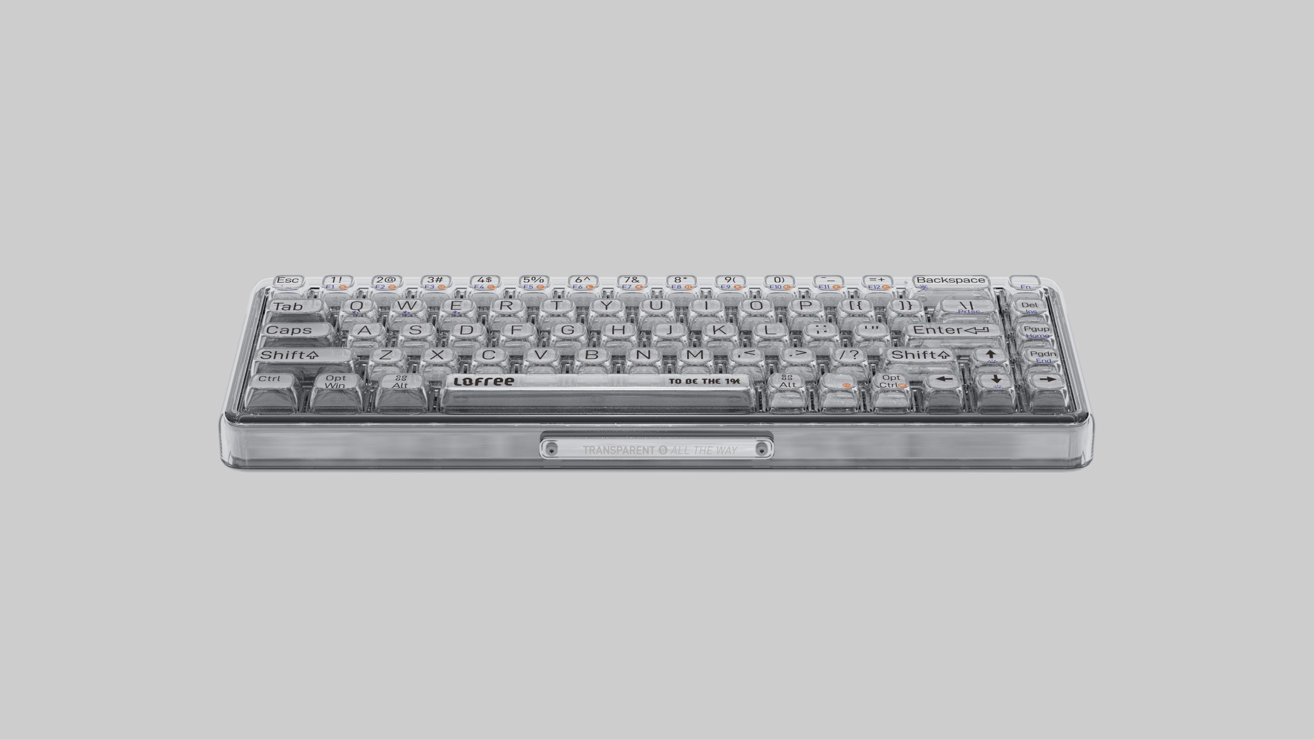 Then, there's the Lofree 1% mechanical keyboard, coming with an almost fully transparent design. Besides the lettering in the keycaps, everything else is transparent. That includes the patented PBT keycaps, the chassis, and the Cherry MX Jellyfish switches. Featuring a 68-key layout backlit by white LEDs with seven lightning effects, the 1% is supported by Windows, macOS, iOS, and Android devices. Like the Wanderfree Moment, it has dual connection modes and allows you to switch between devices easily. Lastly, it packs a 2000mAh battery that can last for up to 60 days.
