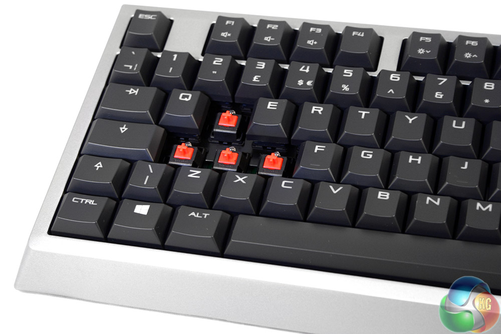 Popping the keys off, we can see that the switches are typical Cherry MX Red – at least on the surface – with the usual off-centre LED placement. Unfortunately as we know from past reviews, that requires clever placement of key indicators, otherwise they do not light up correctly. That does not appear to be something Cherry has attempted with this board, so we can expect mismatched lighting with some keys.