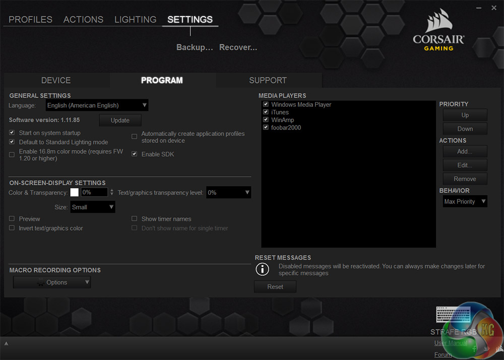 Other features of the board such as the 100 per cent NKey rollover, media keys, windows-key lock are all welcome additions, especially alongside the updated Corsair Utility software. The lighting options in particular have been expanded from the standard STRAFE model , offering a number of different out of the box lighting modes, or you can make your own, much like we did with the Corsair Gaming Vengeance K70.