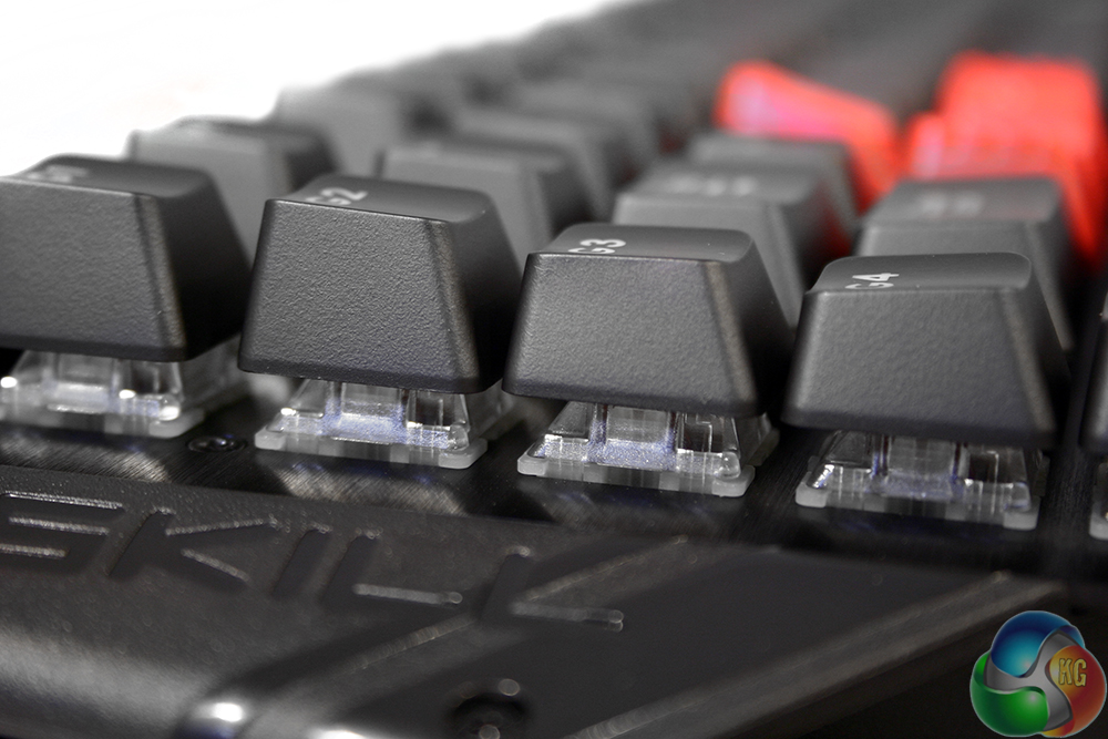 The clear plastic body of these Cherry switches are designed to mitigate one of the main problems with this switch type. Unlike some of the new mechanical switches produced by Steelseries and Logitech, which have the LED mounted in the centre, Cherry's MX switches mount the LED at the ‘top' of the switch. While that does provide backlighting, it means that the intensity of it is off-centre, so keys with multiple functions cannot always light up every part of them evenly.