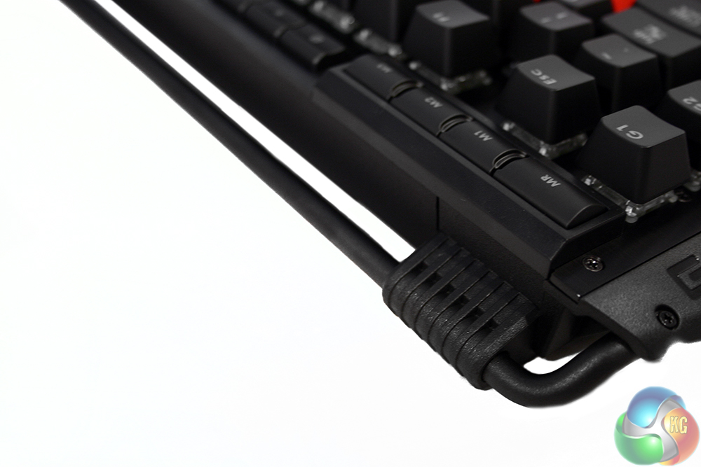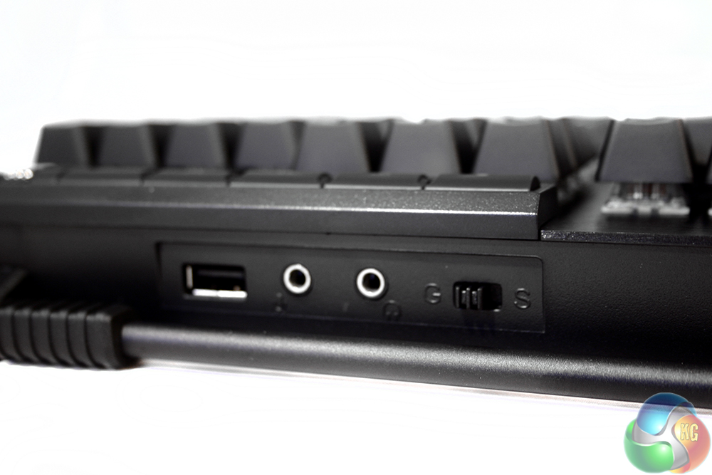 It is also where you will find the USB pass-through port, for those wishing to plug-in headphones, a mouse or any other USB device for simple connectivity. There are also headphone and microphone ports and a small switch, which is used to switch between standard six-key rollover and N-Key rollover, which allows for any number of keys to be pressed – and more importantly, registered – at once. It is a little confusing, the “G” is for N-Key rollover and the “S” for “standard.”