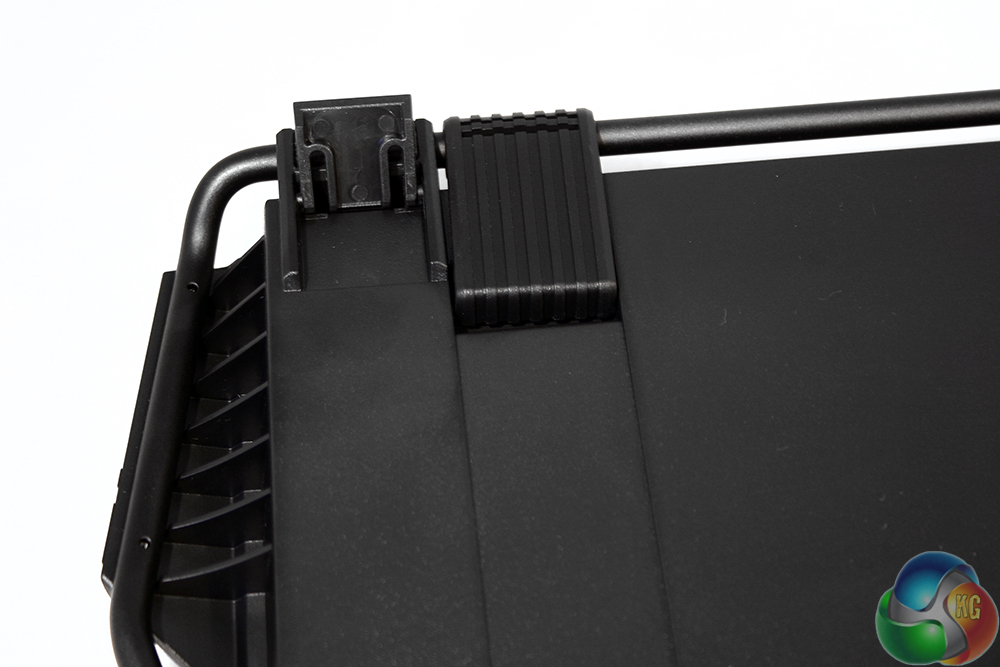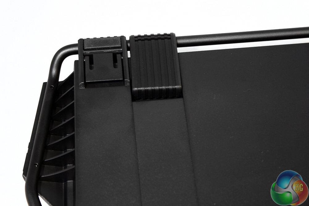 The board itself is black with a brushed aluminium chassis and plastic edging. There is also an external metal frame-work of pipes that runs around the circumference. This is used to clip on extras such as the key-cap case, as well as provide stability and carry grip-points.
