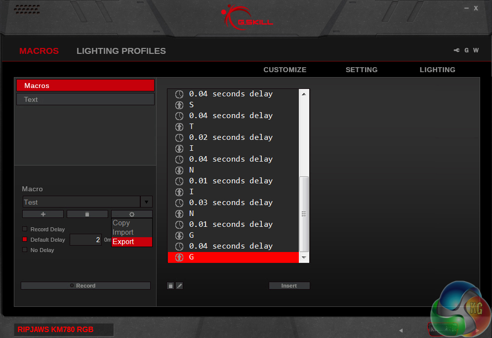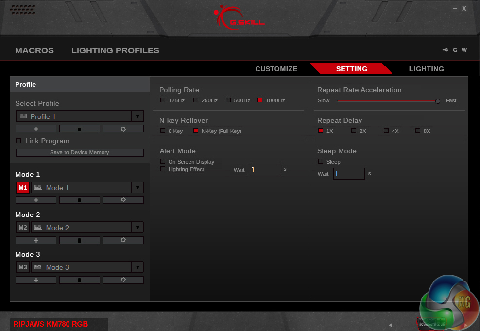 The software for the G.Skill KM780 is pretty fully featured. Keys can be easily remapped or given different functions and macros can be recorded and tweaked, with set delays between presses, or none at all. There are three modes that can be switched to on the fly and the profiles can even be stored locally on the keyboard itself, so if you switch systems on occasion you will still have all of your custom key presets.