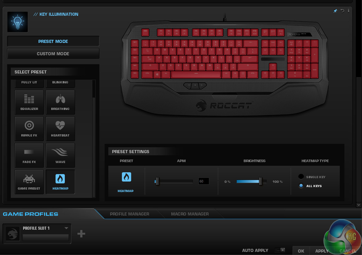 I also enjoyed the expanded capability offered by Roccat's Easy Shift system. Roccat's keyboards replace the Capslock key with an EasyShift switch. When pressed, that activates a secondary mode for every key on the board. While most are at default mapped to their standard functions, this lets you essentially have double the use on the entire board.