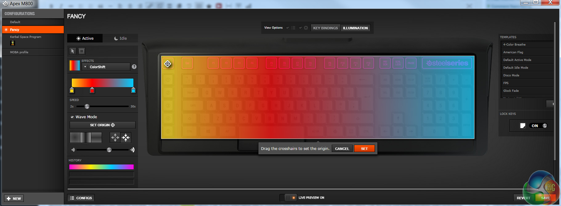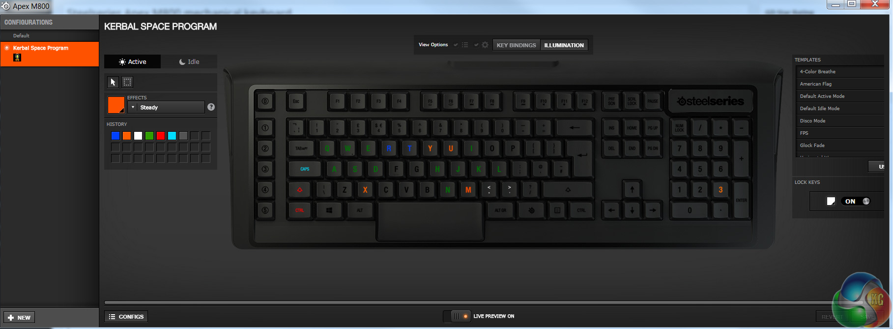 Moving on from the Apex M800's raw abilities however, I enjoyed the lighting options a lot. It was great being able to customise them to my heart's content, making little effects with the wave and breathe functions. I particularly liked having the lighting profile automatically change when I opened up certain applications – even doing so if you tab in and out. Like this one I made for Kerbal Space Program:
