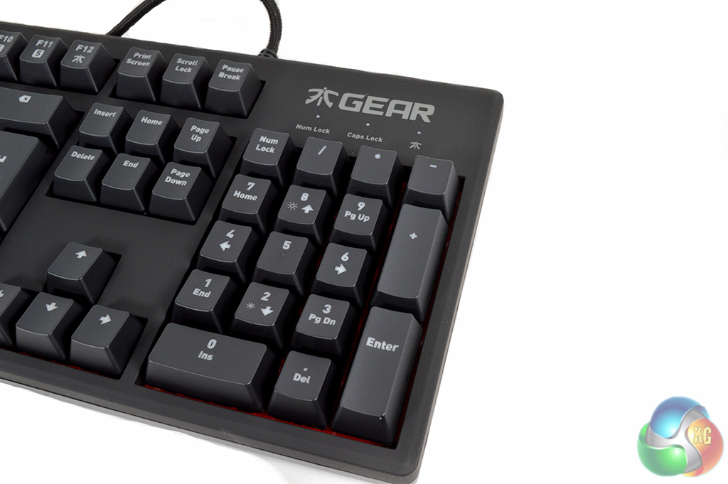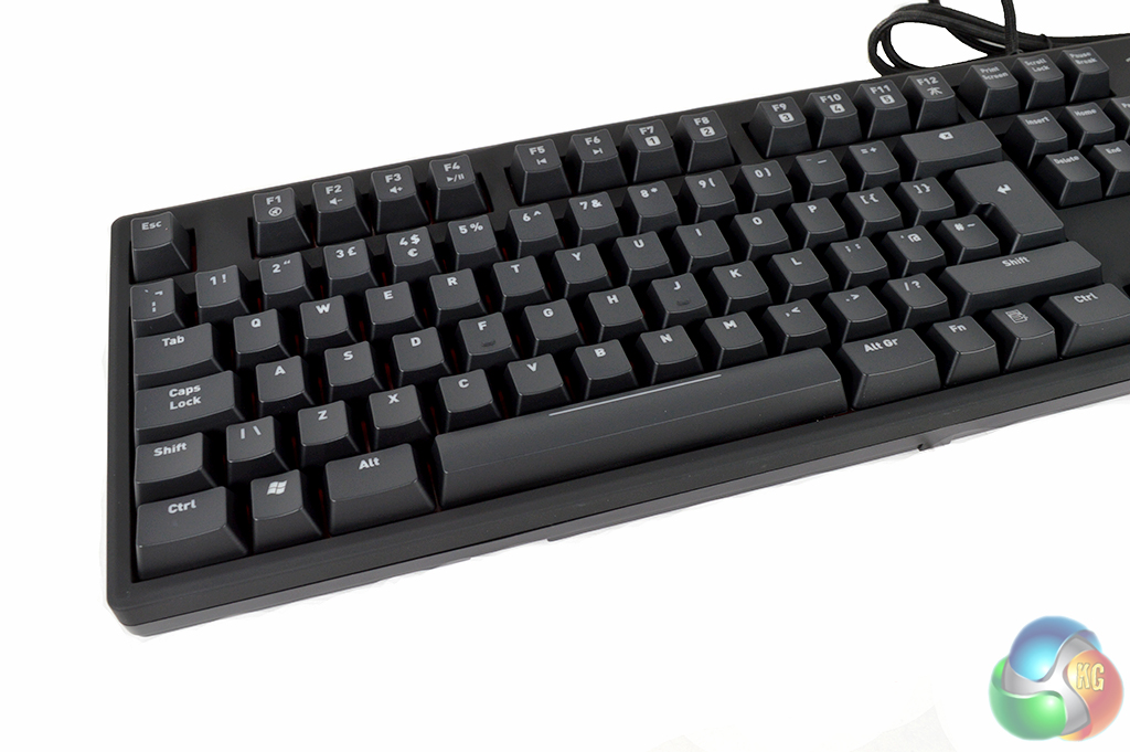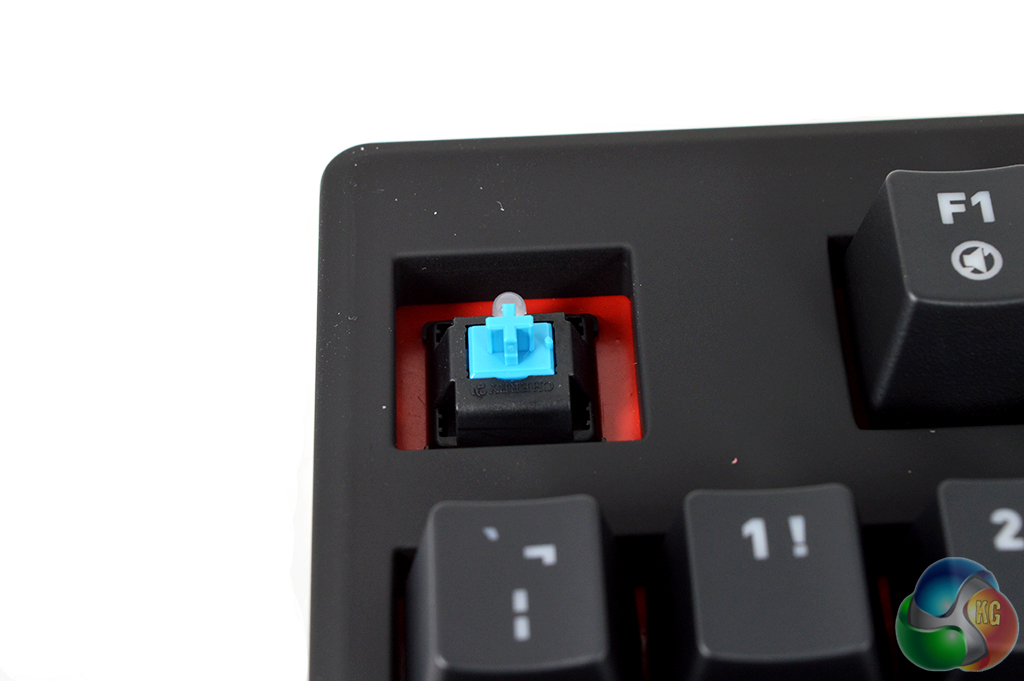 As you can see, our review model uses Cherry MX Blue switches and there is a red board underneath the keycaps to help with overall illumination once the backlighting is turned on.