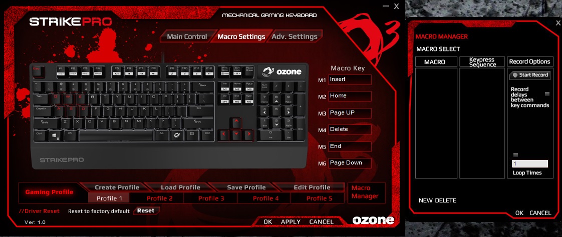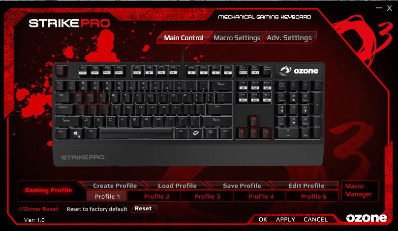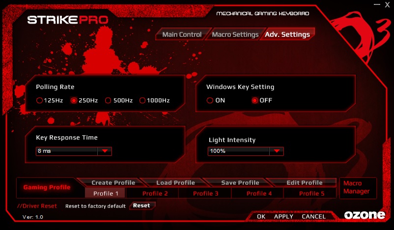 The Ozone Strike Pro does come with some driver software, which will allow you to change the keyboard's polling rate, response time and light intensity. You'll also be able to set up some macros.