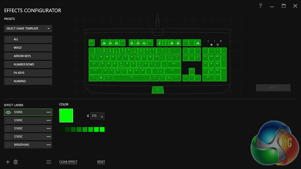 Since this is not a Chroma/RGB keyboard, the lighting window is fairly simple. You have a drop down menu with a few effects listed like wave, ripple, starlight or reactive which is where keys will light up after being pressed.