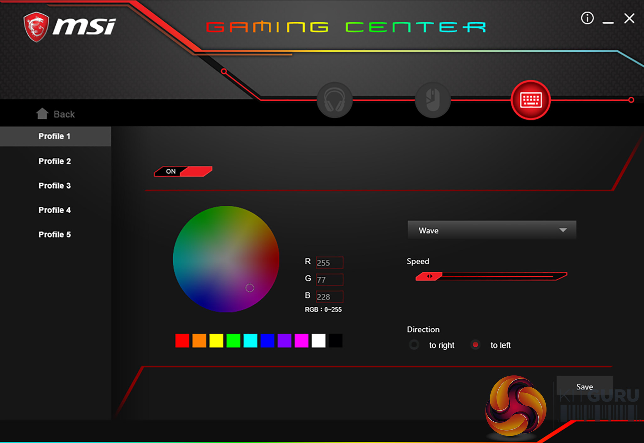 The GK40 has limited customisation built in – so you can start to play with the lights even without the control software installed. For example, the Dragon (function) key can be used in combination with certain other keys to adjust brightness, cycle colours and change the ‘wave frequency’ etc. If you want more control and multiple profiles, then you will need to download and install the latest version of the MSI Mystic Light software.