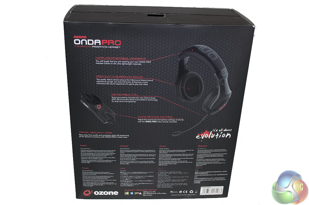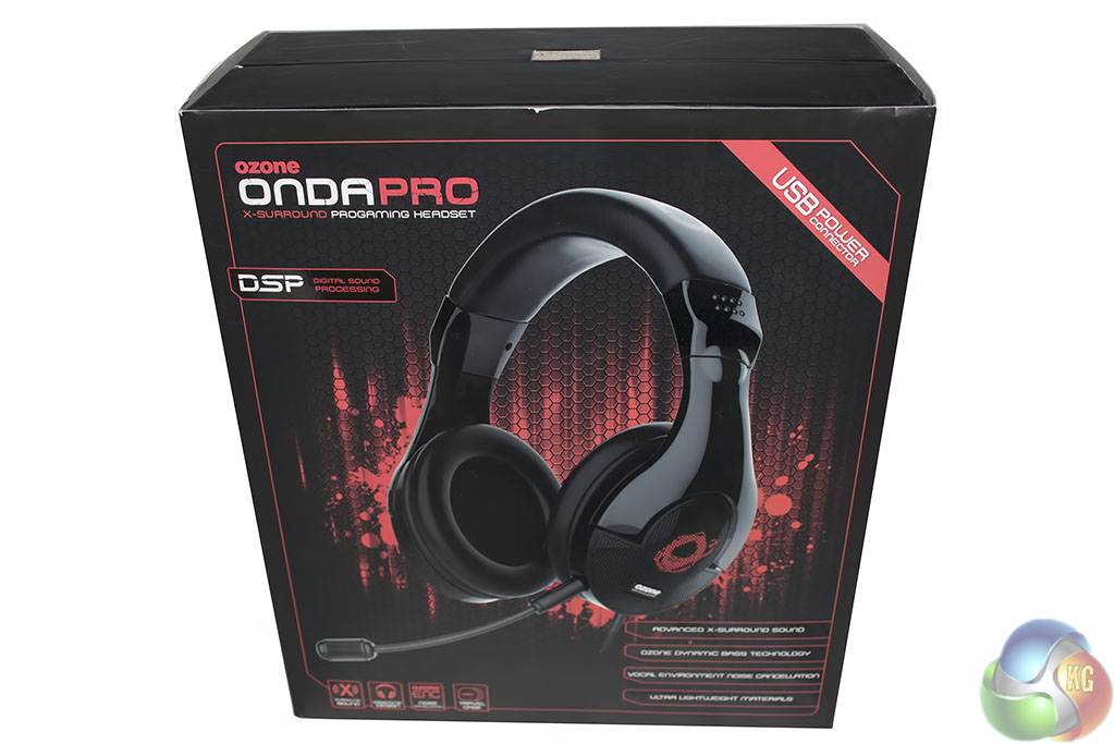 The Ozone Onda Pro headset comes packaged in a plain but sturdy black cardboard box with a product sleeve wrapped around it.