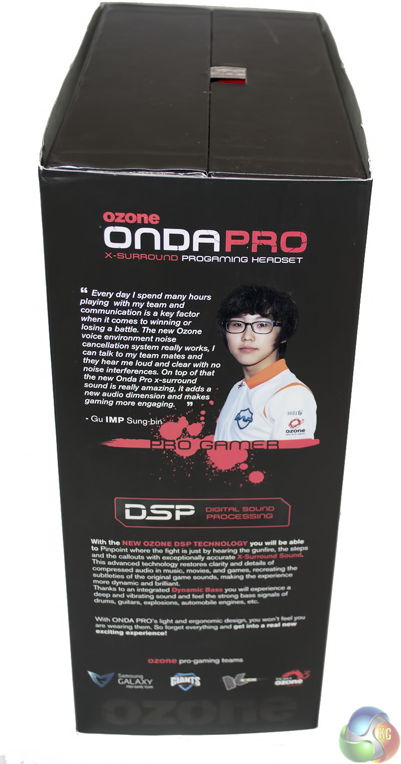 The opposite side features Gu IMP Sung-bin, an Ozone sponsored eSports player, giving a little speech about the product. According to him, “The new Ozone voice environment cancellation system really works” and “the new Onda Pro X-Surround sound is really amazing.”
