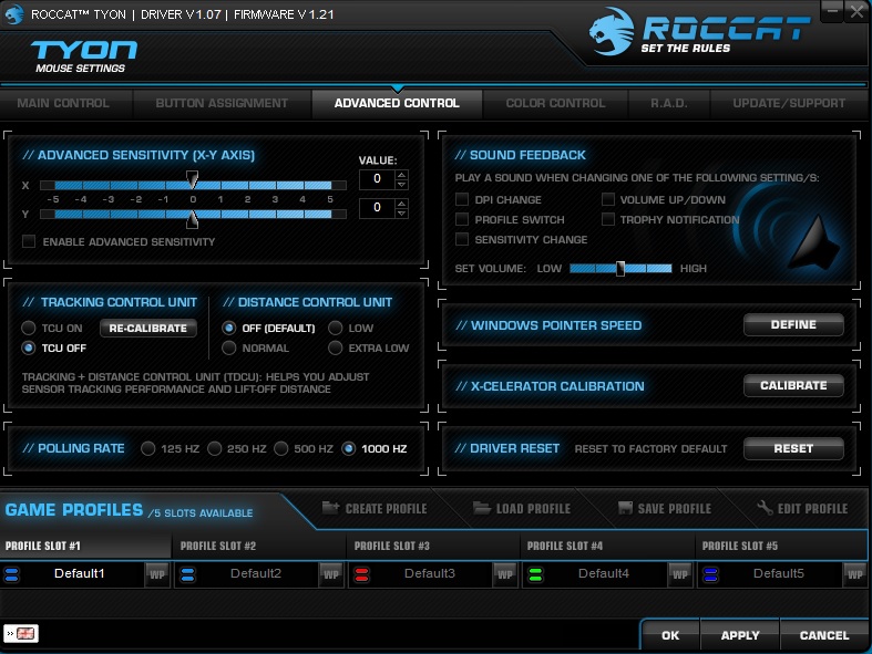 The advanced control section gets a little more in-depth, allowing you to calibrate the X-Celerator switch, edit Windows pointer speed and set advanced sensitivity options. The tracking control unit comes turned off by default but it can help advanced users to adjust the sensor's performance and lift-off distance.
