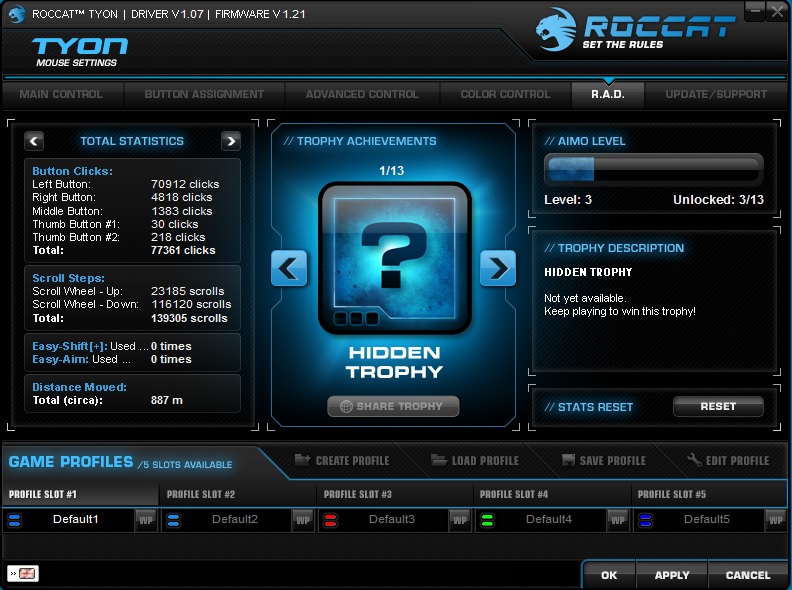The R.A.D tab gives you statistics on the mouse, such as how many times you've clicked each button, total distance moved and how many trophies you have earned, which are unlocked by using the device's features.