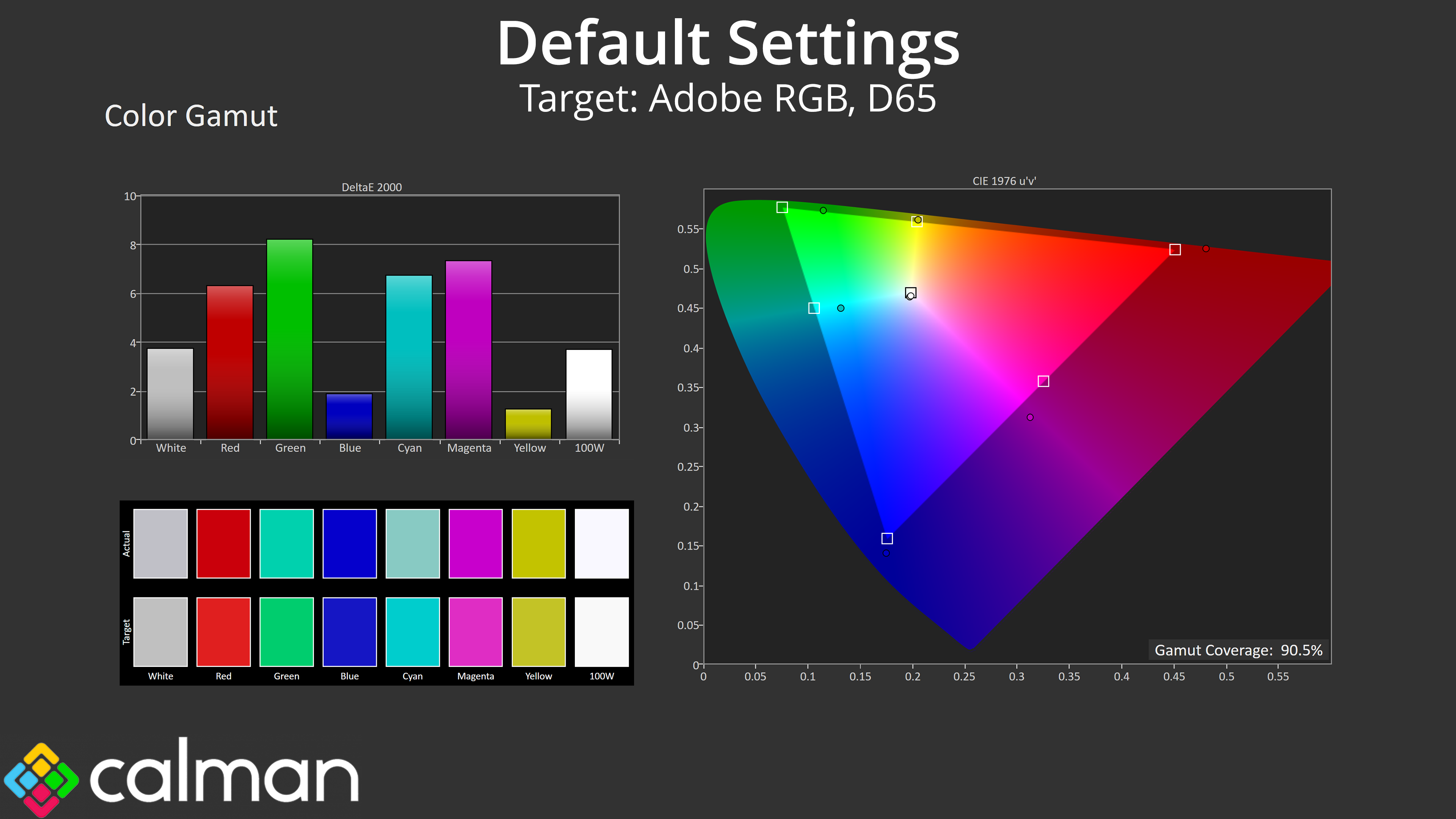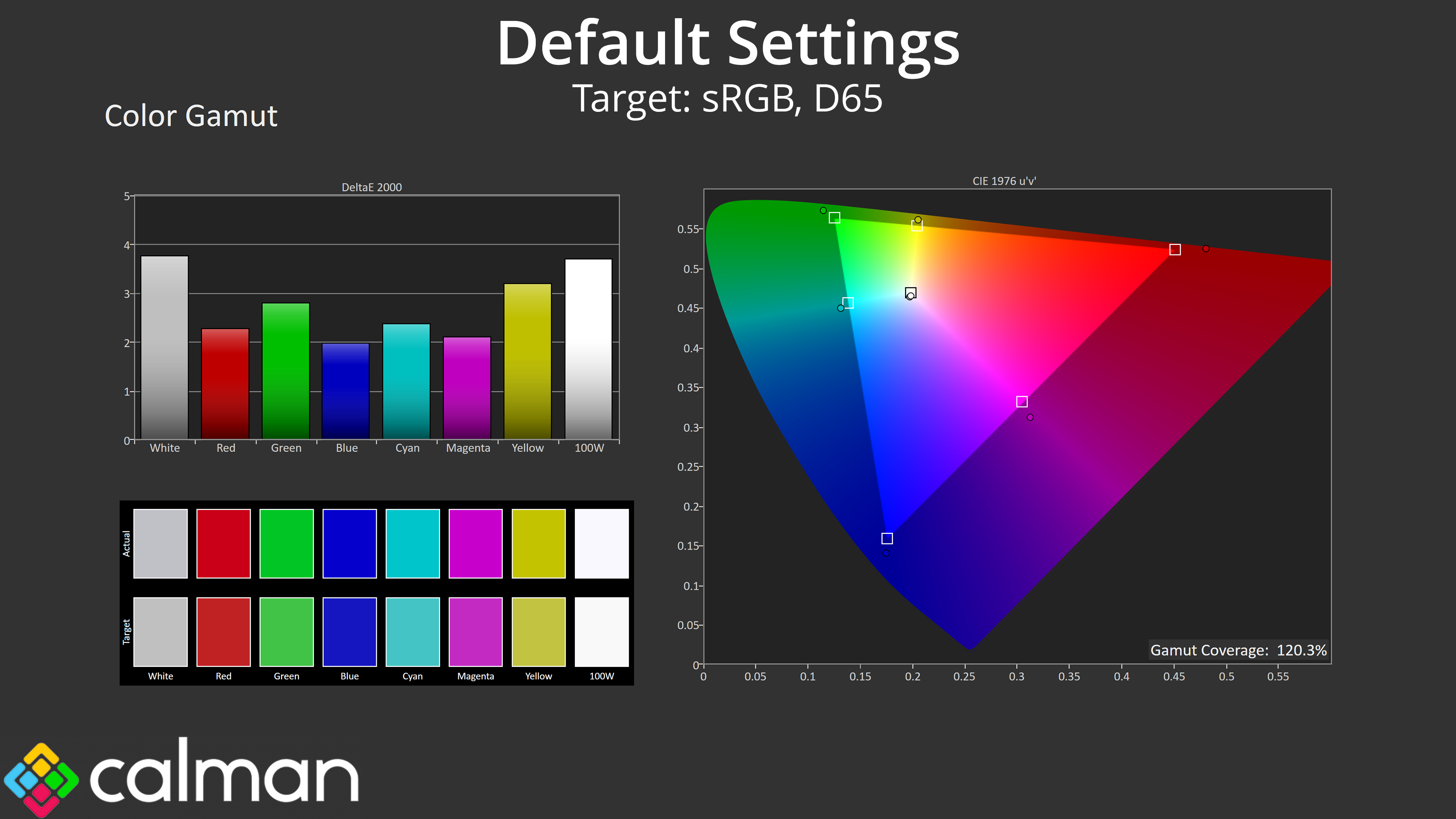 We first run these tests with the display in its out-of-the-box state, with all settings on default. If there is an sRGB emulation option or other useful mode then we may test that too. We then calibrate the screen using the Calman Ultimate software and run the tests again.