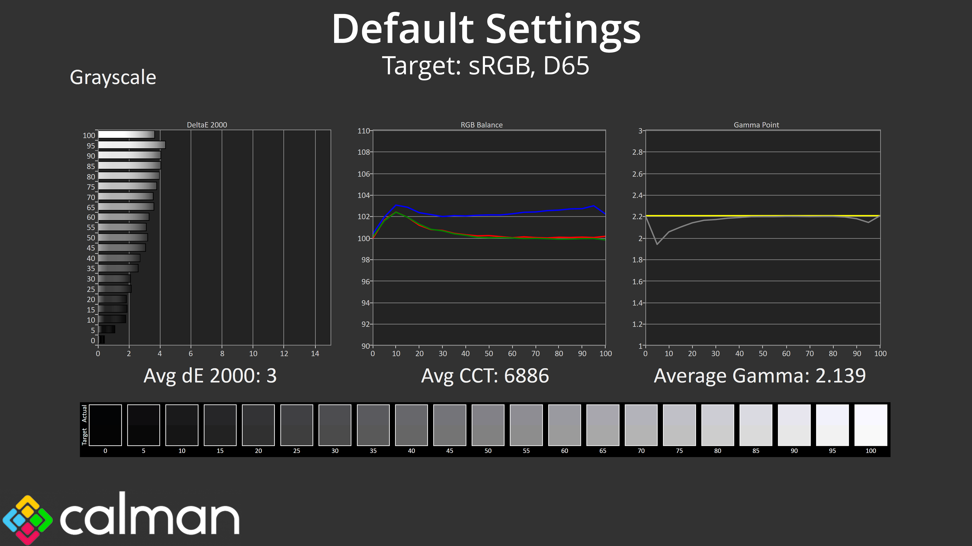 - Greyscale accuracy, measured across 20 shades, with an average colour balance reported.