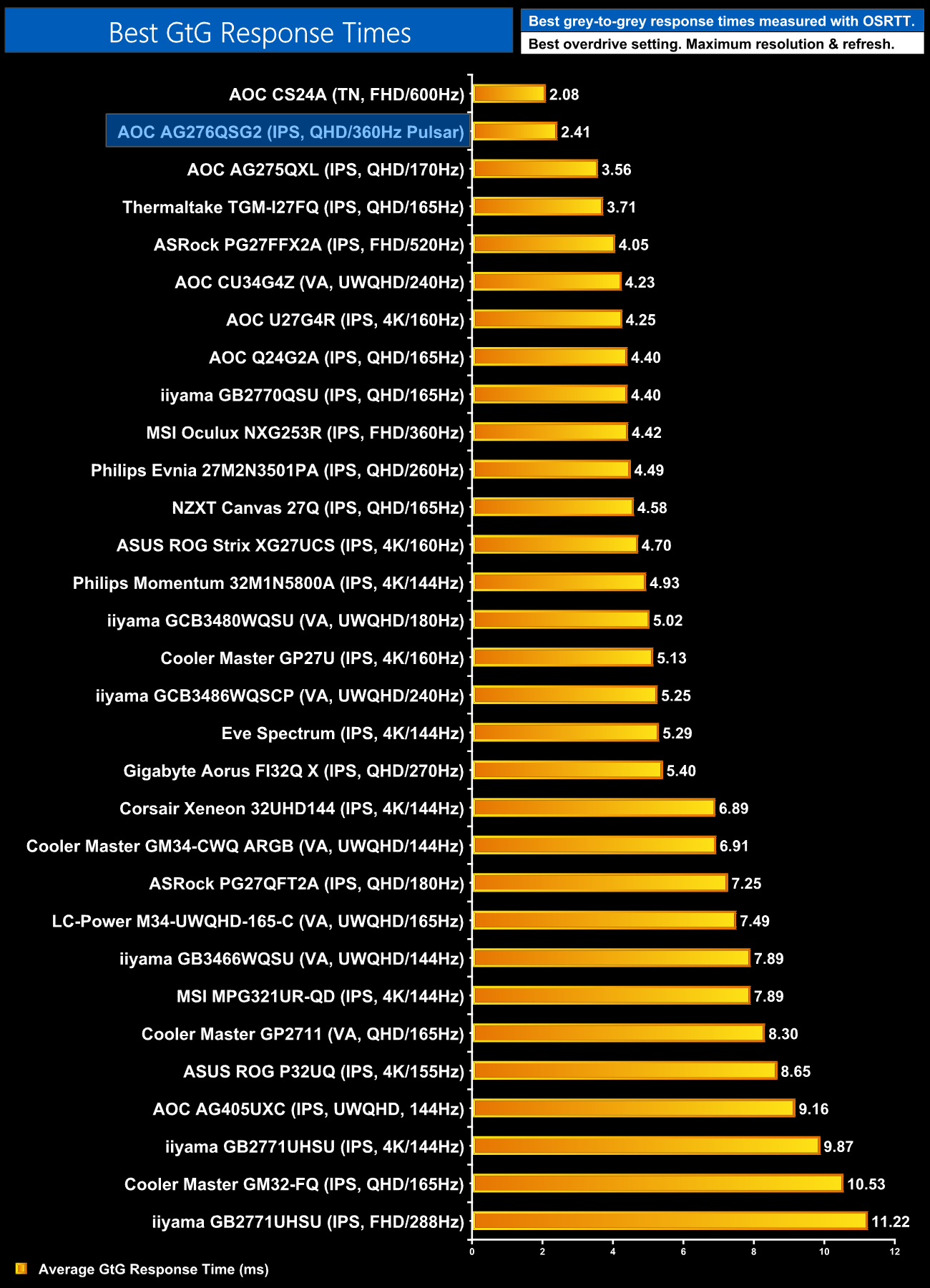 Compared to the rest of the LCD monitors we've tested in recent years, this puts the AG276QSG2 right at the top, second only to the 600Hz CS24A we reviewed very recently. The panel has clearly been very well tuned and that sets it up very nicely for use with G-Sync Pulsar to further improve motion clarity.