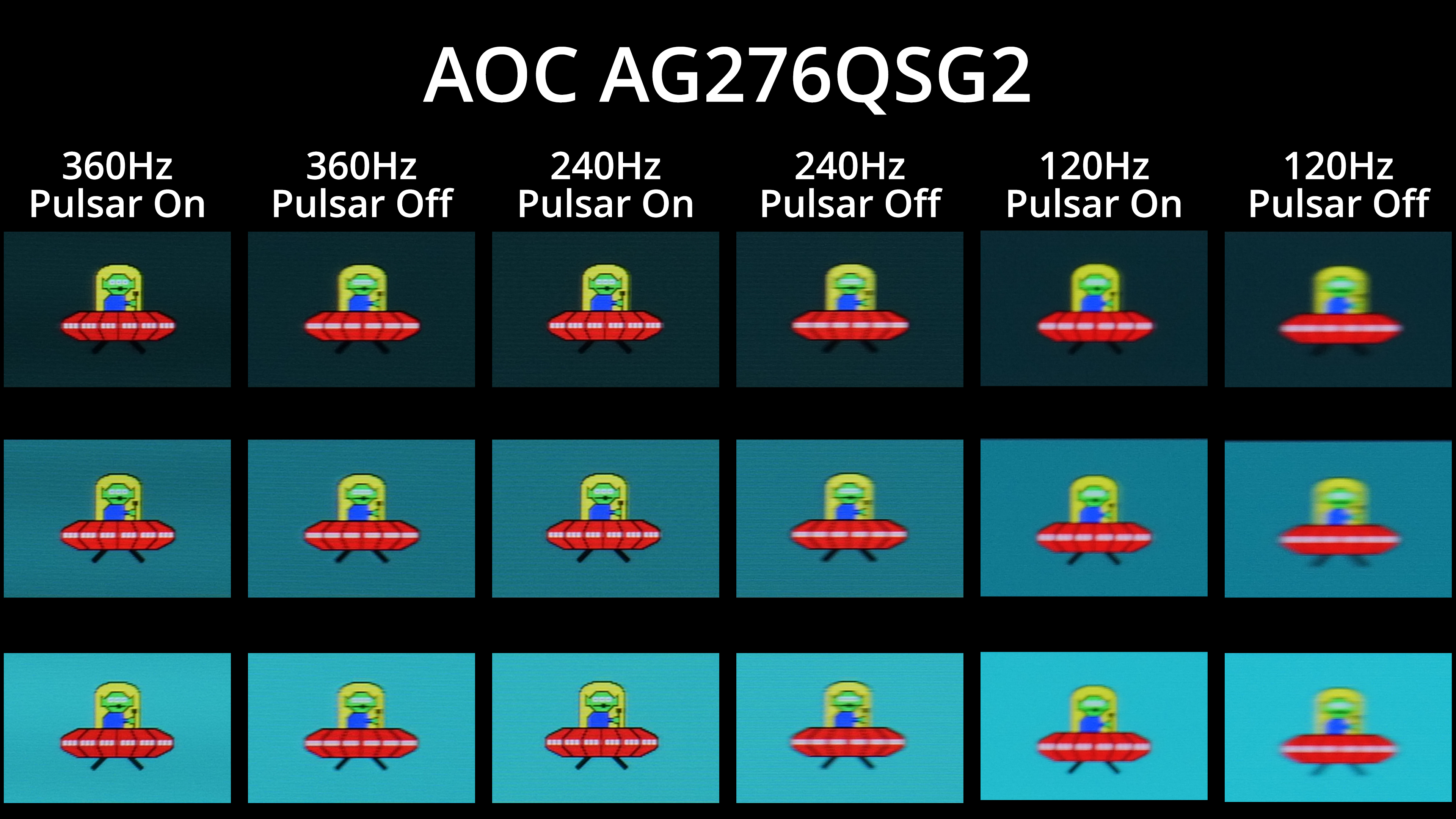 Speaking of Pulsar, let's get right to it and show motion clarity examples with Pulsar on vs Pulsar off, at 120, 240 and 360Hz. It should be immediately obvious that Pulsar makes a huge difference across the refresh rate range – perceived clarity is significantly improved, even at 120Hz, whereas the 360Hz image with Pulsar enabled has very little blur whatsoever.