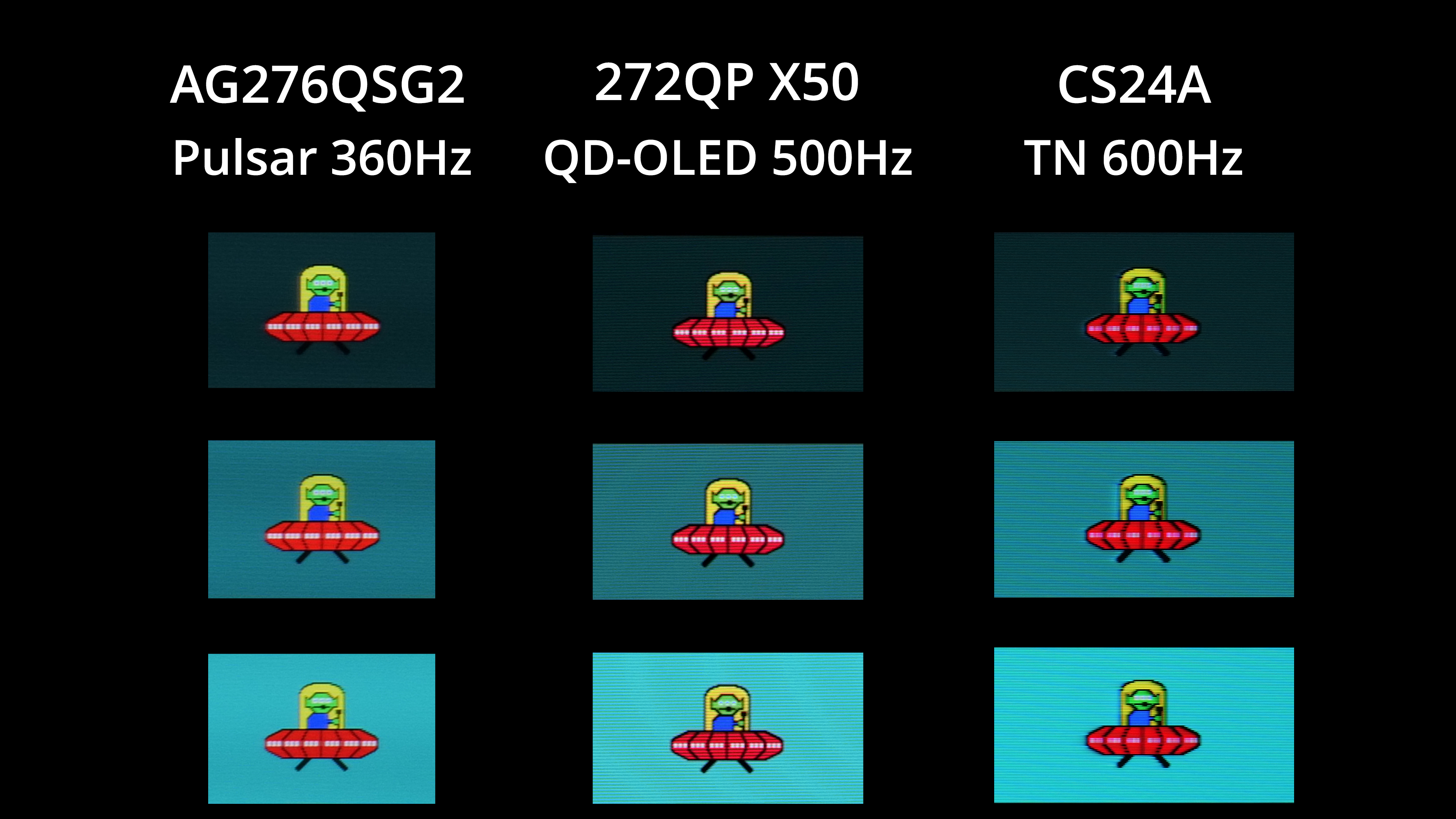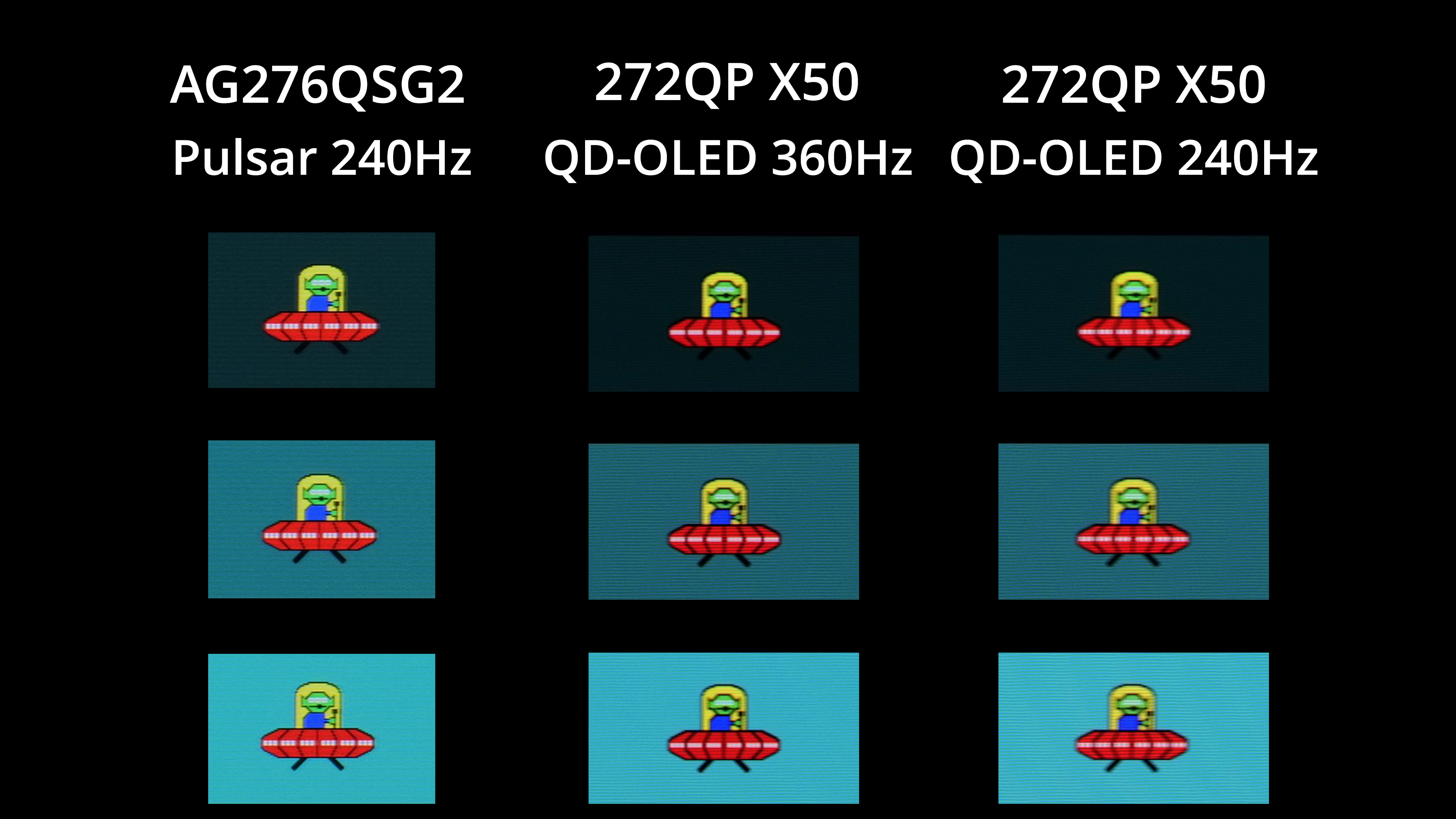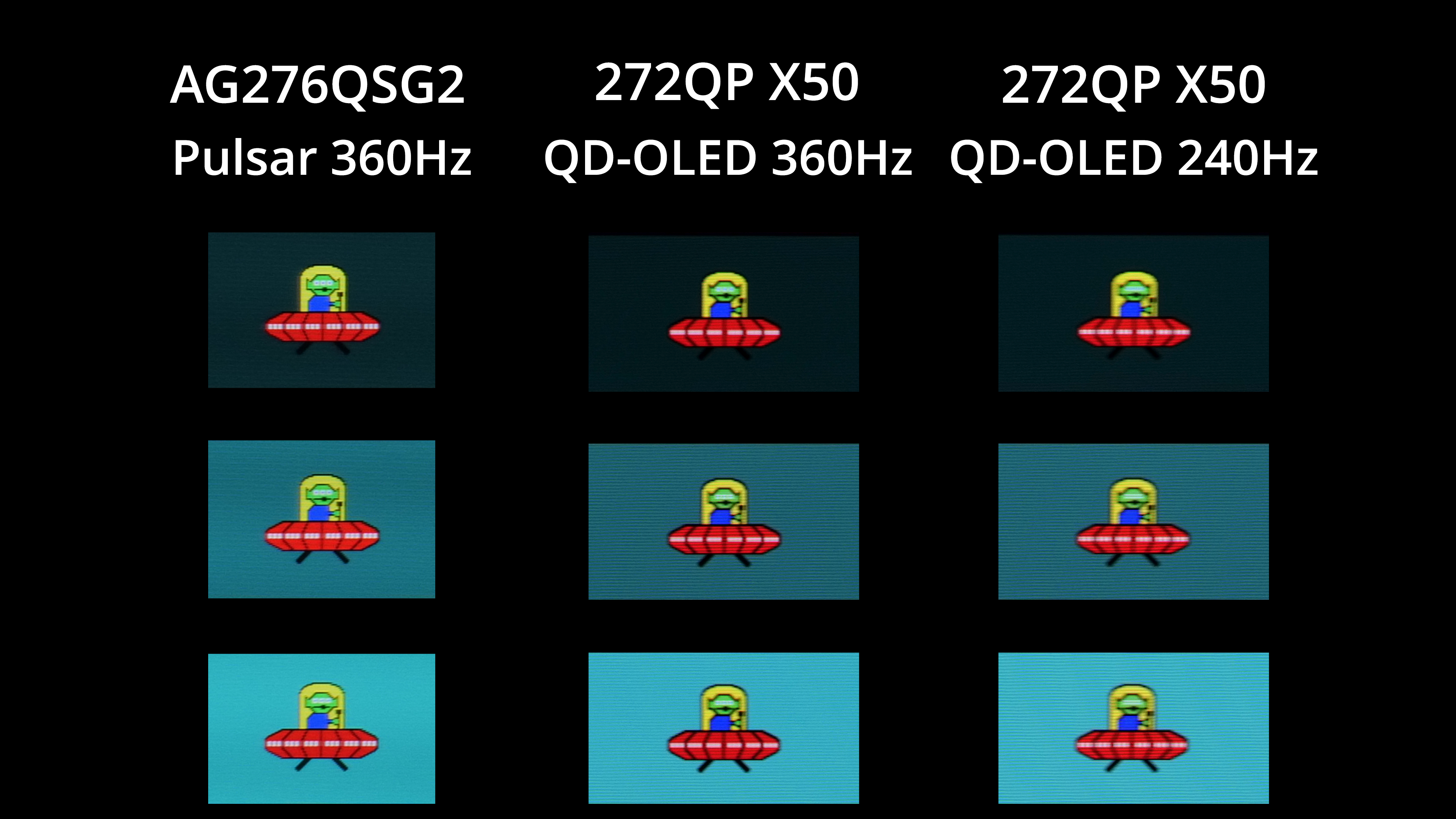 The first thing I wanted to do when I saw the Pulsar results was compare them to a fast OLED screen. I don't unfortunately have test results for OLED at 720Hz, but a 500Hz panel like MSI's 272QP X50 still shows exceptional motion clarity. Pulsar on the AG276QSG2, I think, is even better, with greater clarity around the alien's three eyes, as well as the arm and torso area. It's not a huge difference by any means, but you have to remember this is being achieved at only 360Hz on the Pulsar monitor, whereas the OLED is having to drive an extra 140fps on top to reach the motion clarity we can see there.
