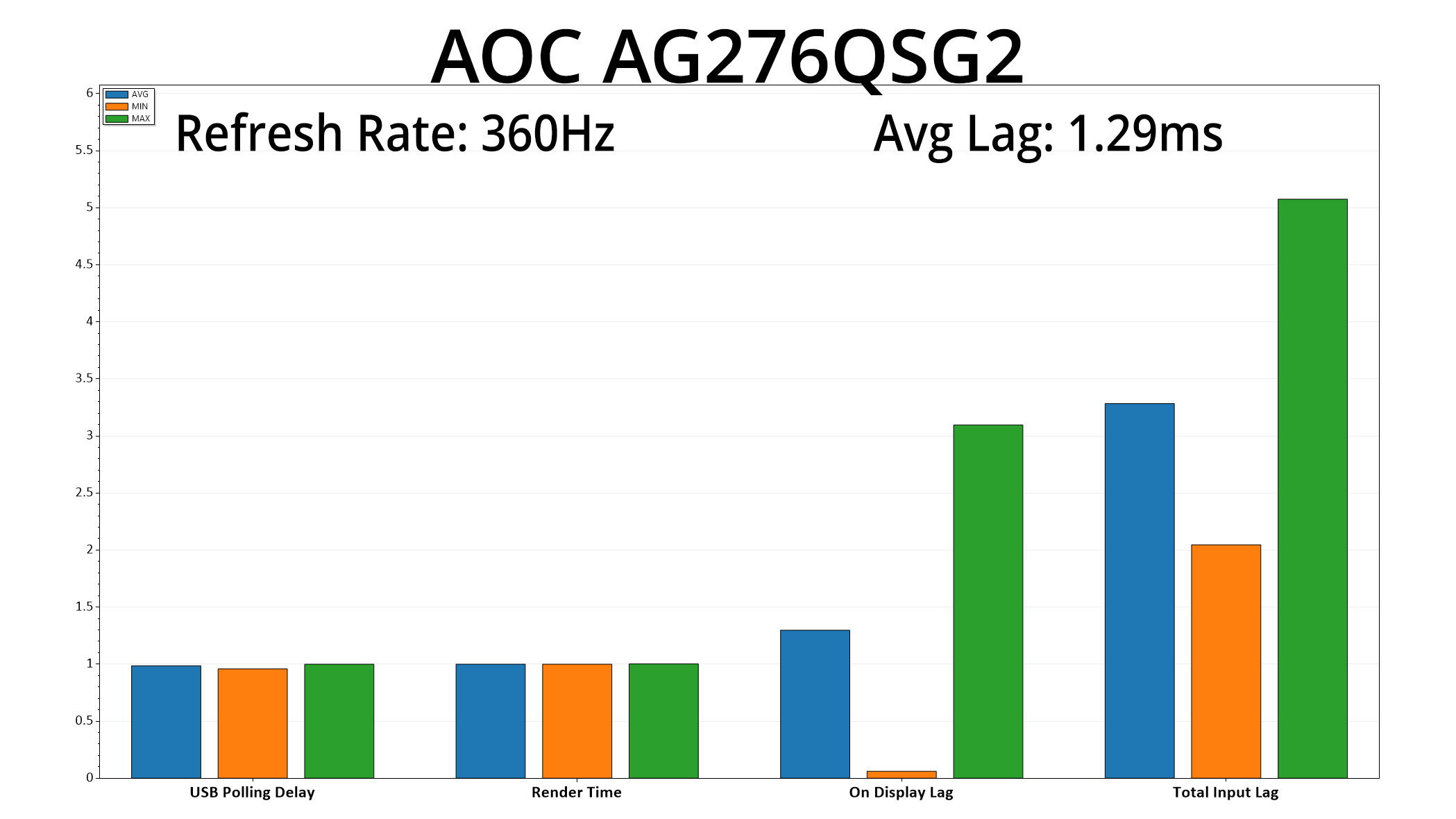 In terms of latency, it's pleasing to see nice and low figures, with the AG276QSG2 averaging just 1.29ms lag, equivalent to just under half a frame at the 360Hz refresh rate, so nothing at all to worry about